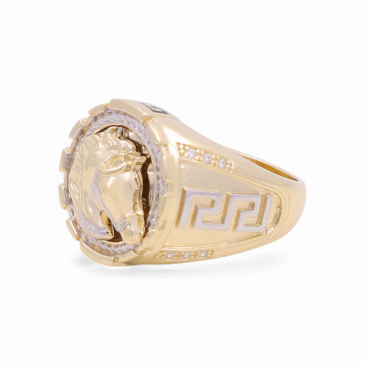 14K Yellow and White Gold Horse Men's Ring with Greek and Cz / Size: 10 / Weight: 12.4 GR / KEEMRTT4HR