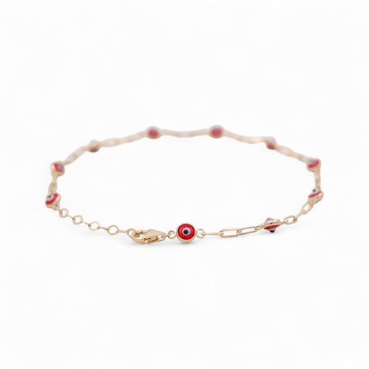 14K Yellow Gold Paper Clip Women's Bracelet with Red Evil Eyes / Size: 8.5 " / Weight: 2.6 GR / CCFWB4EY