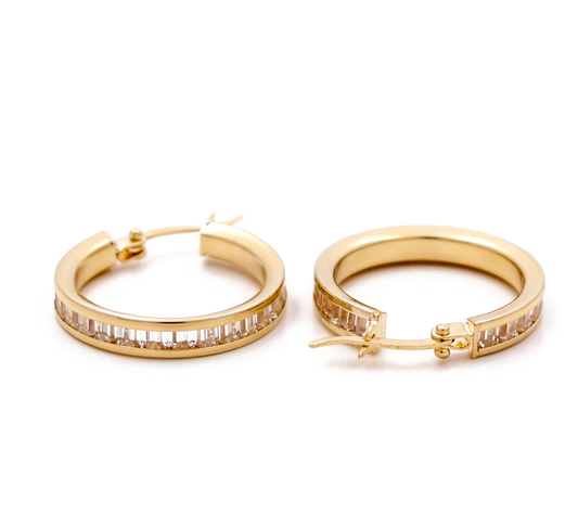 14K Yellow Gold Hoops Earrings with Baguette / Size: 3.2mm 17mm / Weight: 2.8 GR