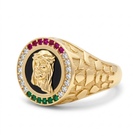 10K Yellow Gold Christ Men's Ring with Onyx and Multicolor Cz / Size:12 / Weight: 7.6 GR