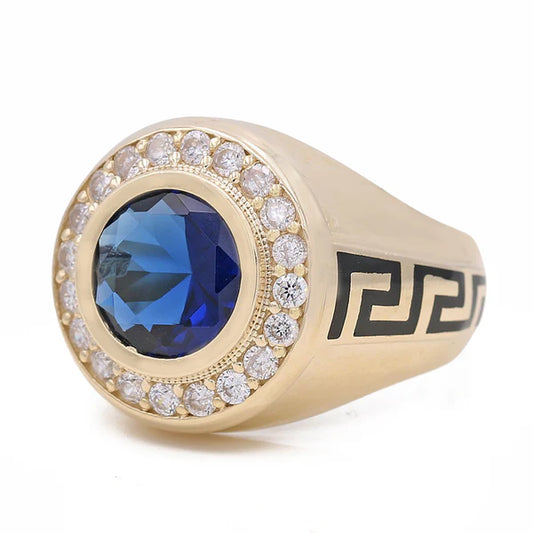 14K Yellow Gold Round Men's Ring with Black Enamel Greek and Blue Cz / Size: 10 / Weight: 9.2 GR / BOMR4FS-8