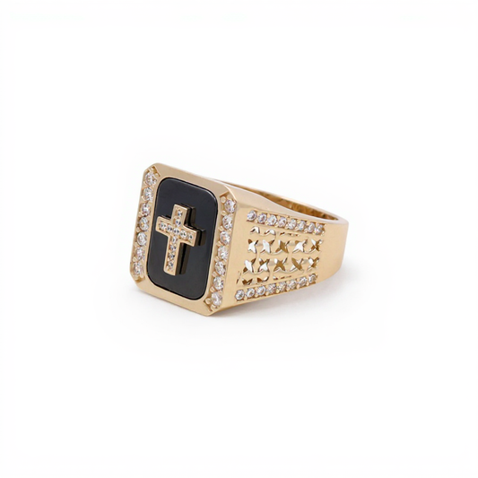 10K Yellow Gold SQ Cross Men's Ring with Onyx and Cz / Size: 11.5 / Weight: 7.7 GR / CQMR0CS-4