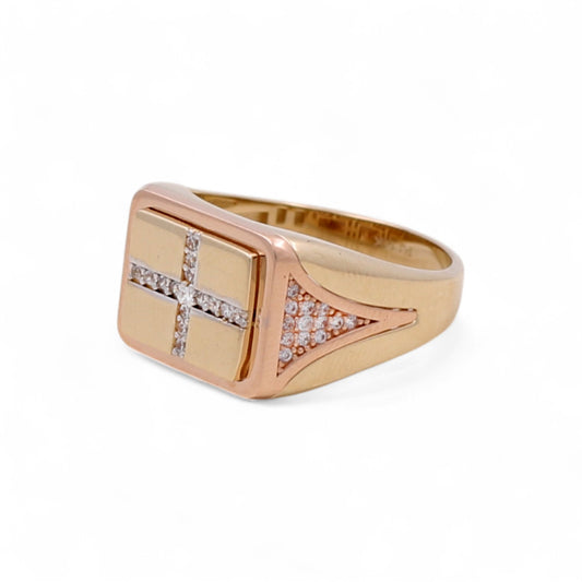 14K Yellow and Rose Gold Cross Men's Ring with White Cz / Size: 11.5 / Weight: 5.1 GR / DQMRTT4CS