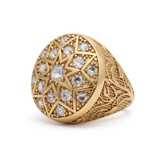 14K Yellow Gold Men’s Ring RD Rosetta Style with Star and White Stones / Size 10.5 / Weight: 16.5 GR / DOMR4FS-12