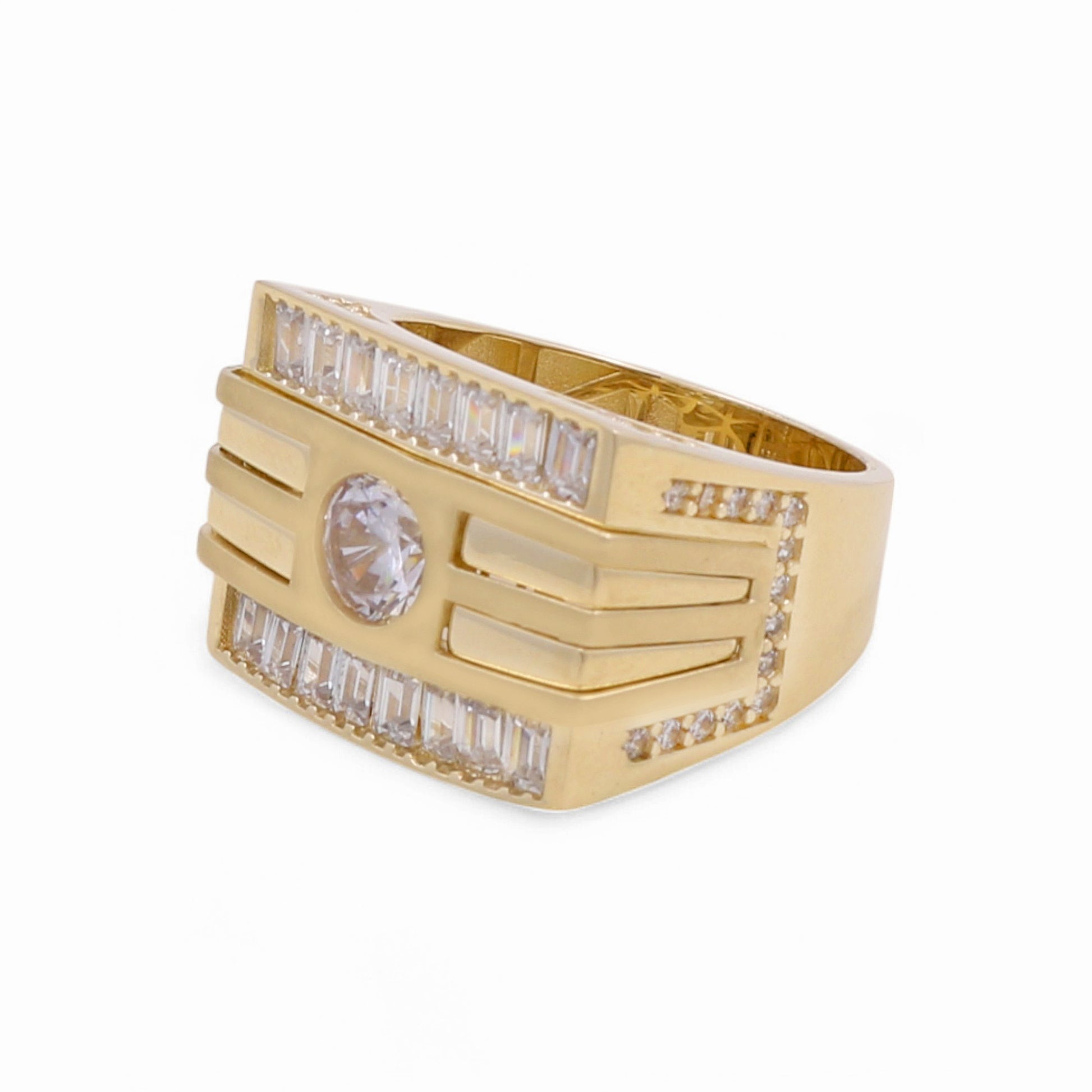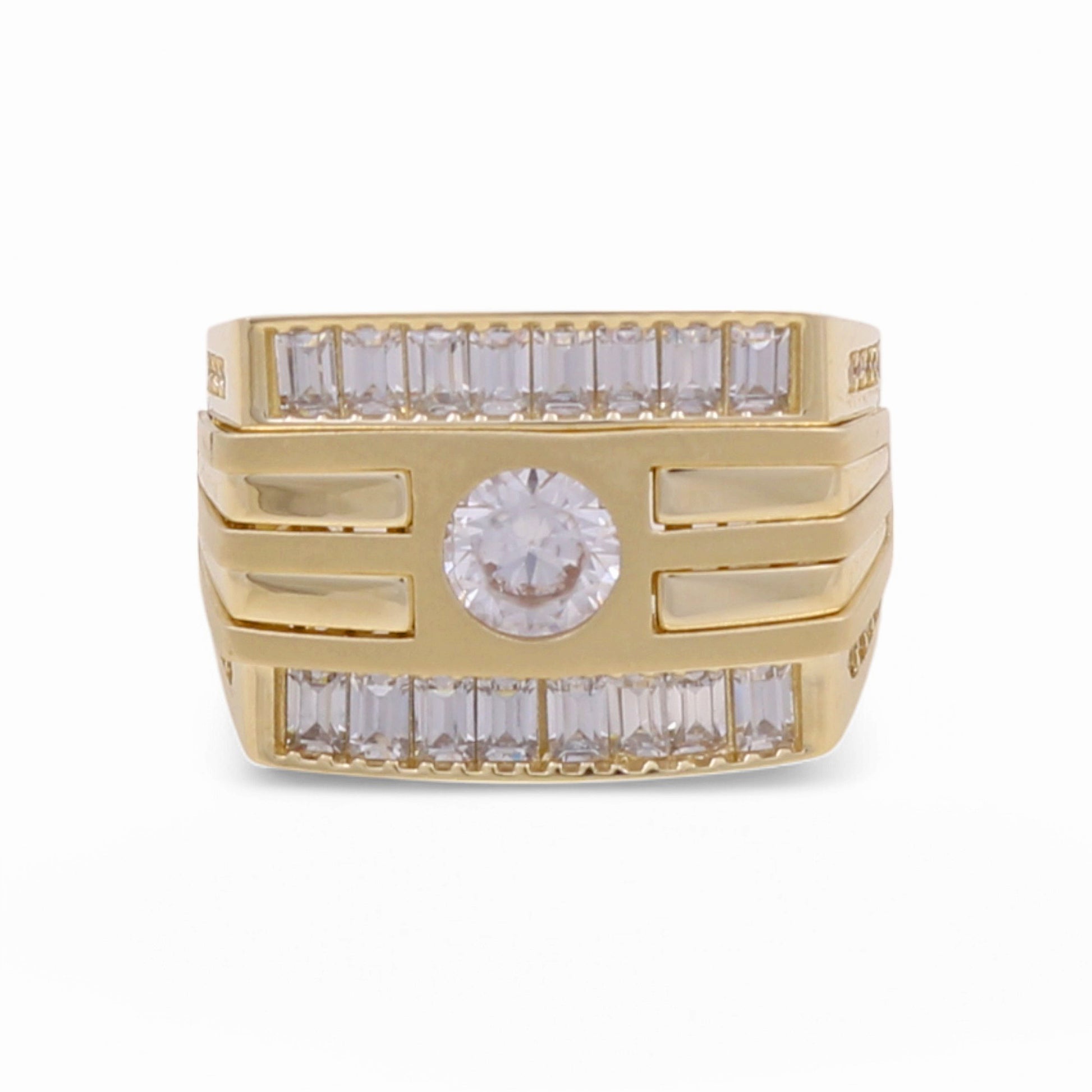 This stylish 10K yellow gold men’s ring features a sleek, modern design set with baguette-cut white stones that add sharp brilliance and refined detail. Its clean lines and polished finish make it a standout piece that blends contemporary fashion with timeless appeal.