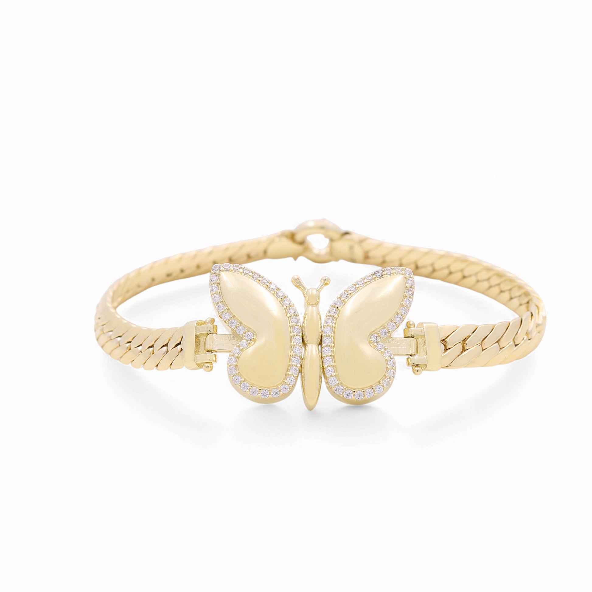 This 10K yellow gold women’s Cuban link bracelet blends classic strength with delicate detail, featuring a polished butterfly centerpiece adorned with sparkling cubic zirconia. The design pairs bold gold with graceful elegance — perfect for everyday wear or special moments.