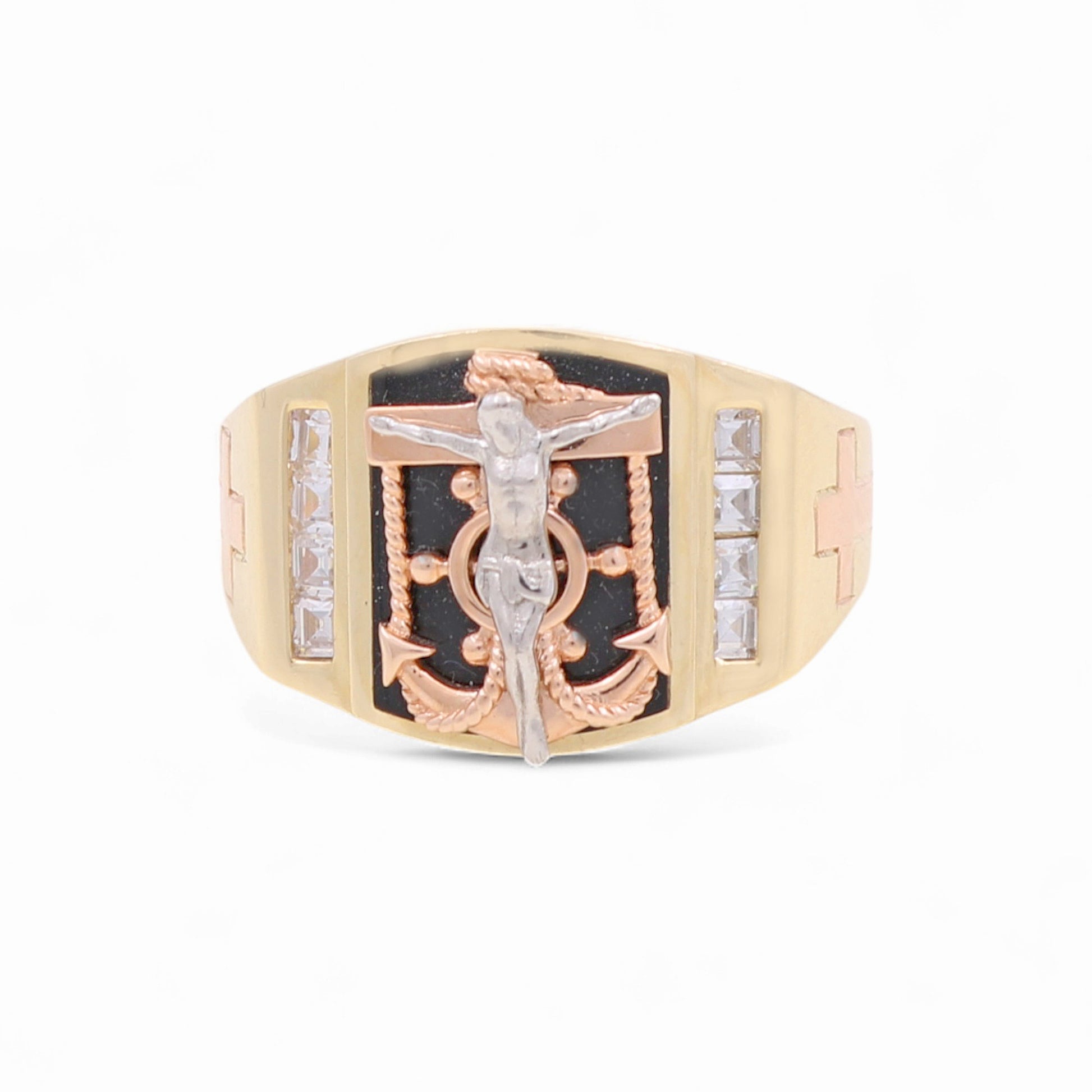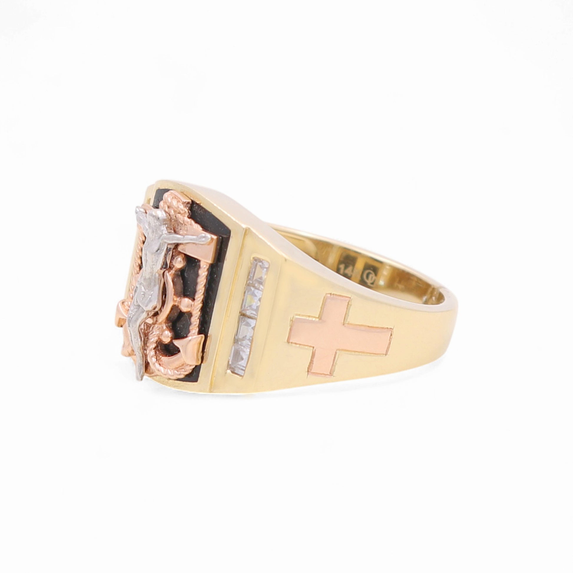 This striking 14K three-tone gold men’s ring features a bold square design and a detailed image of Christ, crafted in yellow, white, and rose gold for a rich, dimensional look. Accented with sparkling cubic zirconia, this piece is a powerful tribute to faith, strength, and devotion—designed to be worn with pride.