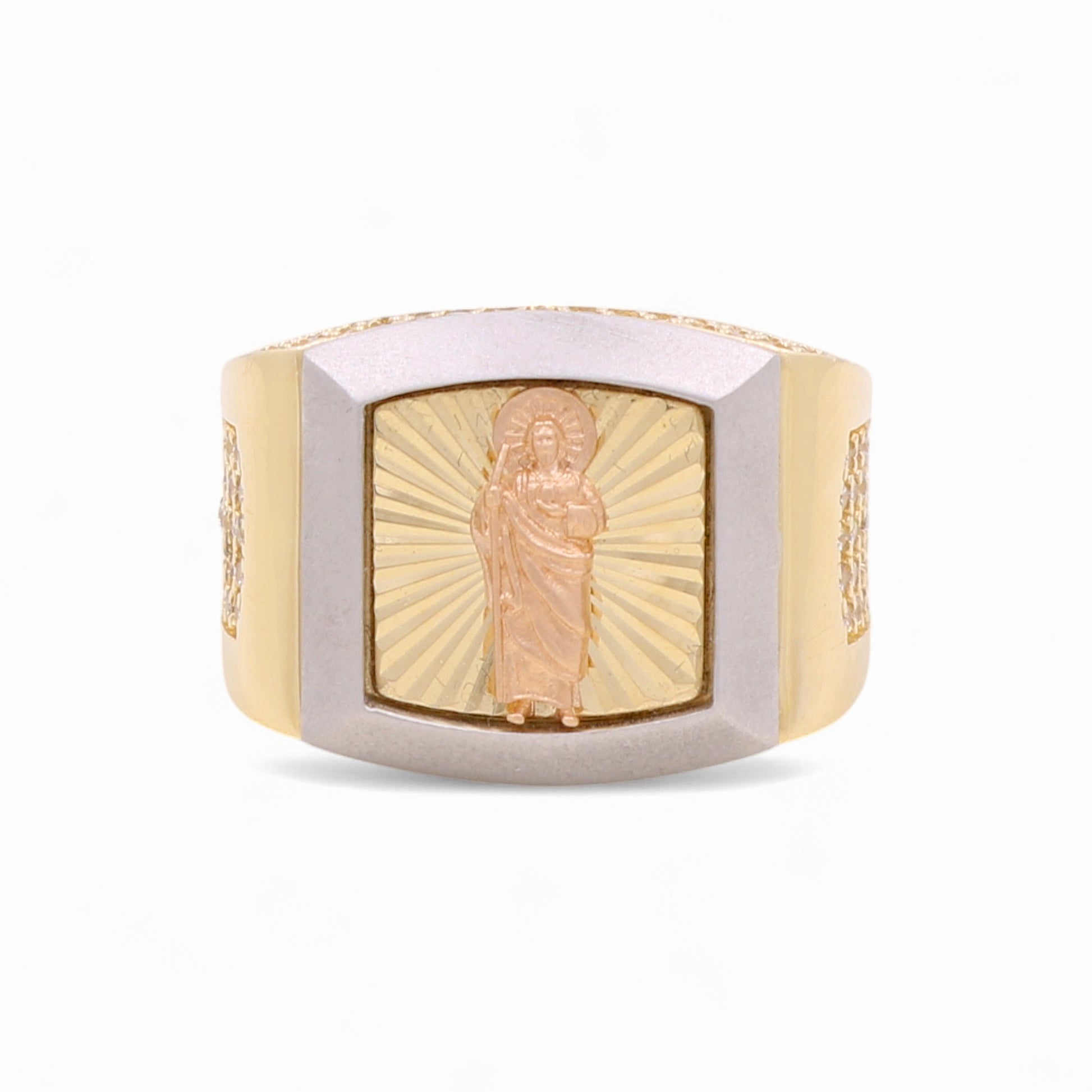 Honor your devotion with this bold 14K three-tone gold San Judas men’s ring, featuring a striking square design adorned with a detailed image of San Judas Tadeo, the patron saint of hope and protection. Accented with yellow, white, and rose gold, and finished with a sparkling cubic zirconia, this ring blends spiritual significance with standout style.