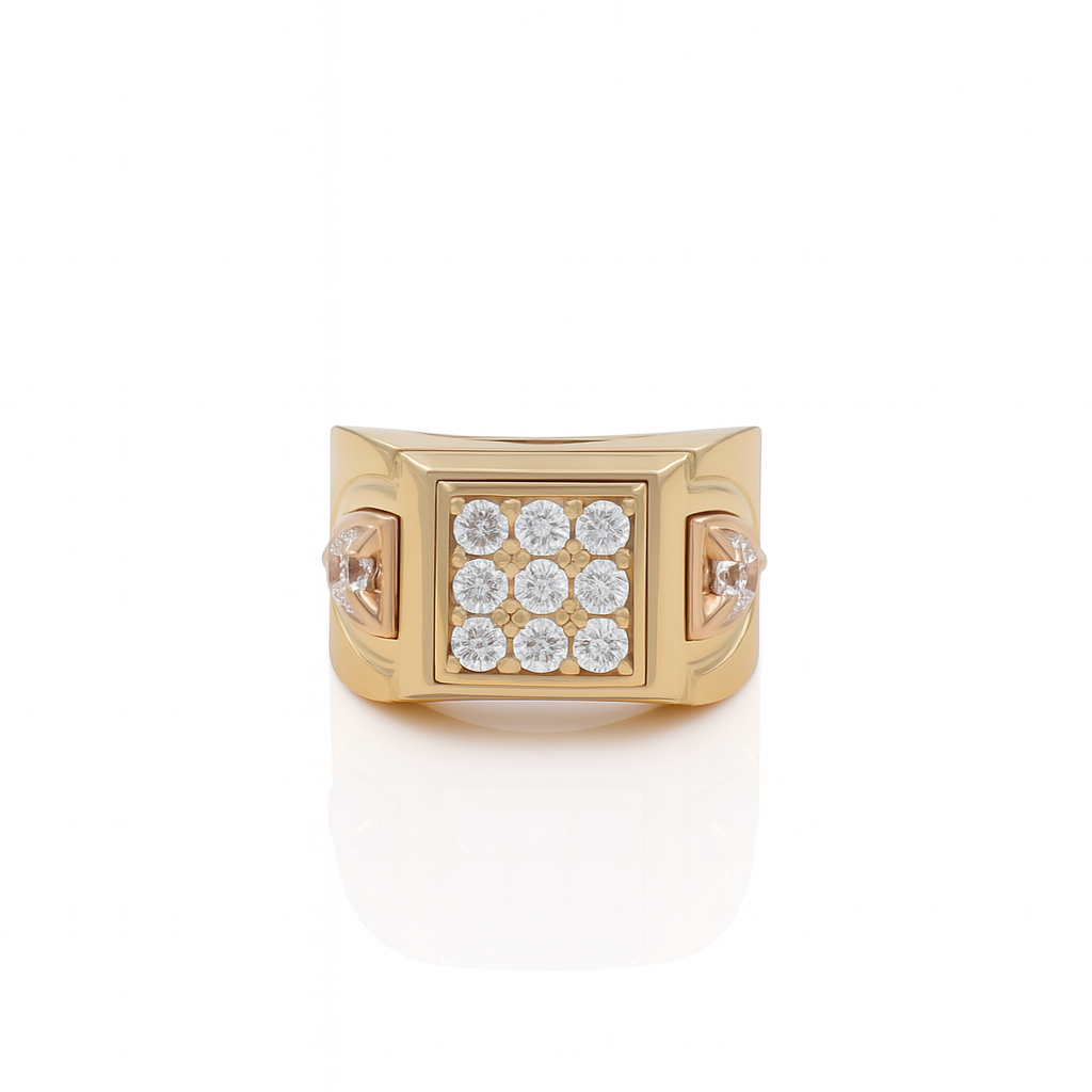 This bold and modern men’s ring showcases a polished two-tone design in 14K yellow and rose gold, enhanced with brilliant white cubic zirconia for an elevated look. Weighing 6.2 grams, it's a stylish and refined piece that balances everyday wear with standout elegance.