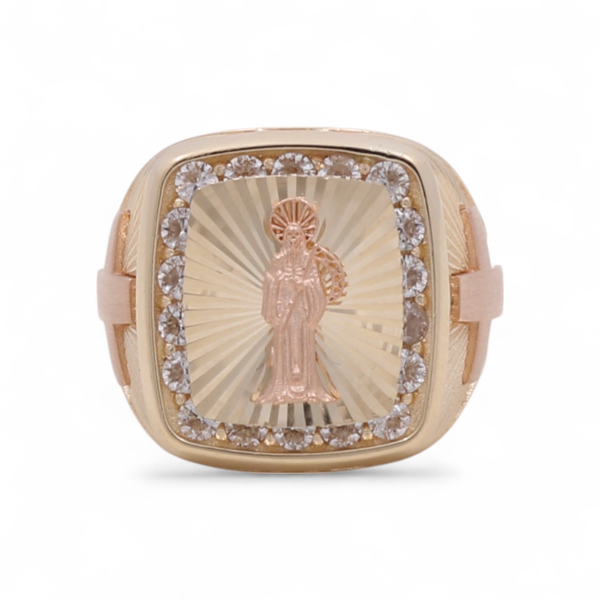 This powerful men's ring showcases a detailed Santa Muerte design crafted in 14K yellow and rose gold, symbolizing protection and strength. Brilliant white cubic zirconia adds a luminous contrast, emphasizing its spiritual and bold aesthetic. With a substantial weight of 10.1 grams, it’s a statement piece for those who wear their beliefs with pride.