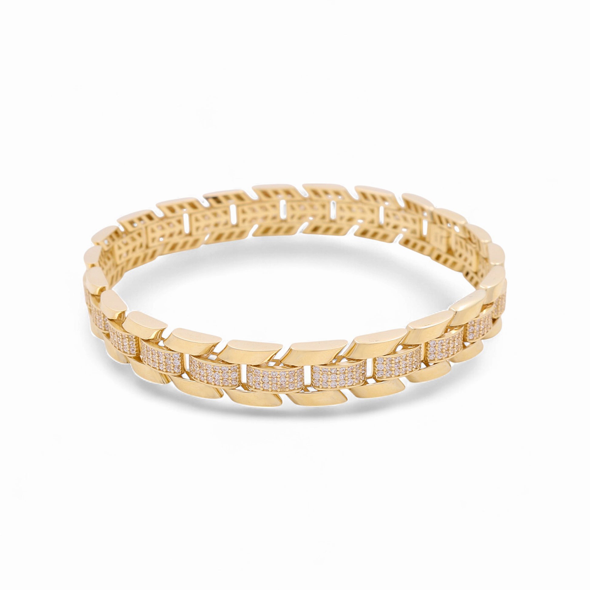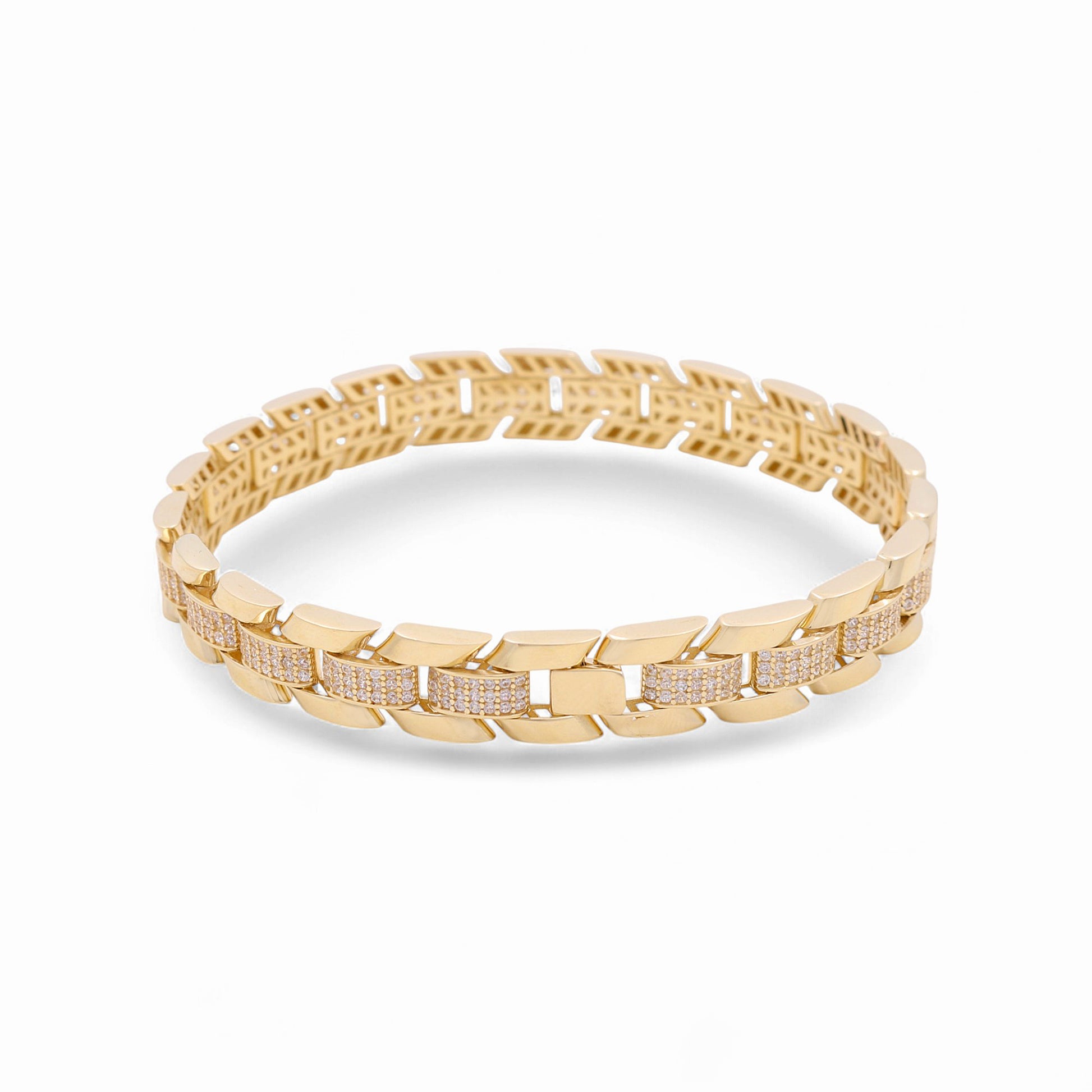 This 14K yellow gold semisolid Italian men’s bracelet features a bold design accented with cubic zirconia, blending classic gold with a touch of brilliance. At 8.5 inches and 22.1 grams, it offers a substantial look with a comfortable fit — perfect for everyday style or elevated occasions.