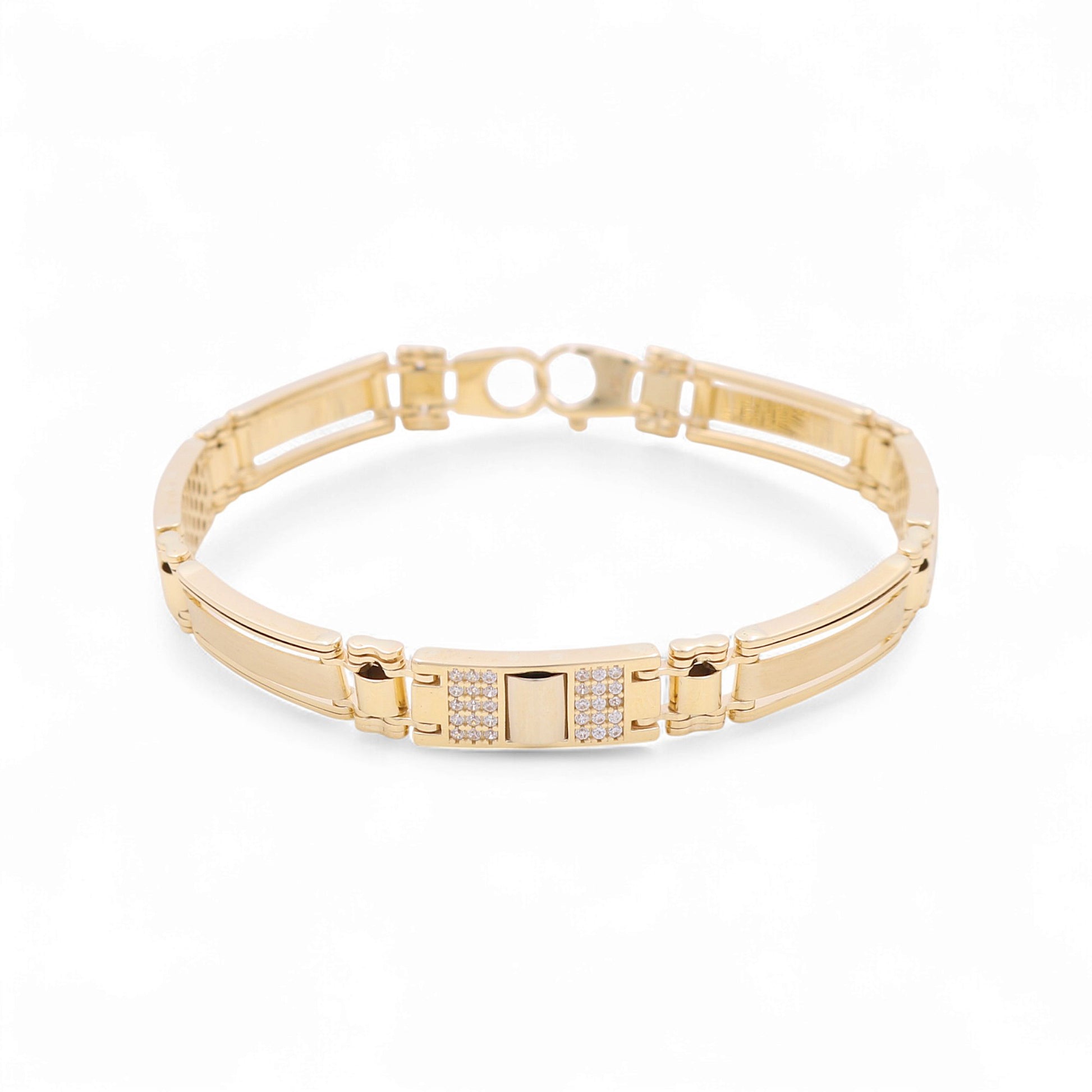 This 14K yellow gold semisolid Italian men's bracelet features a sleek, masculine design enhanced with cubic zirconia accents for a touch of refined sparkle. Measuring 8 inches and weighing 20.6 grams, it offers a strong look with the comfortable feel of a semisolid build.