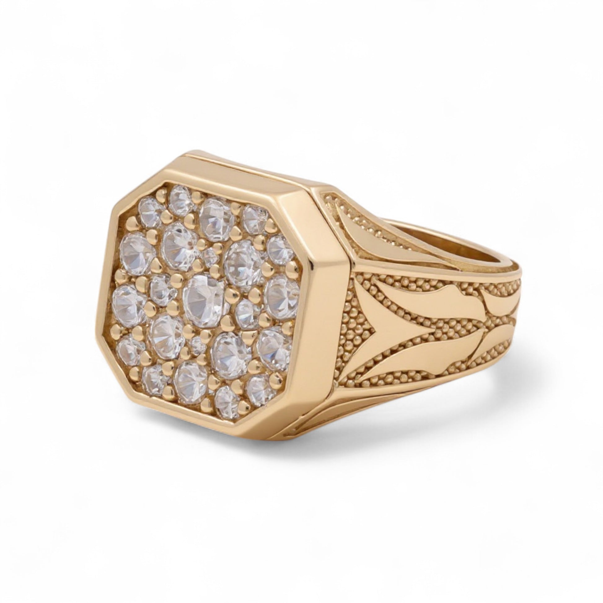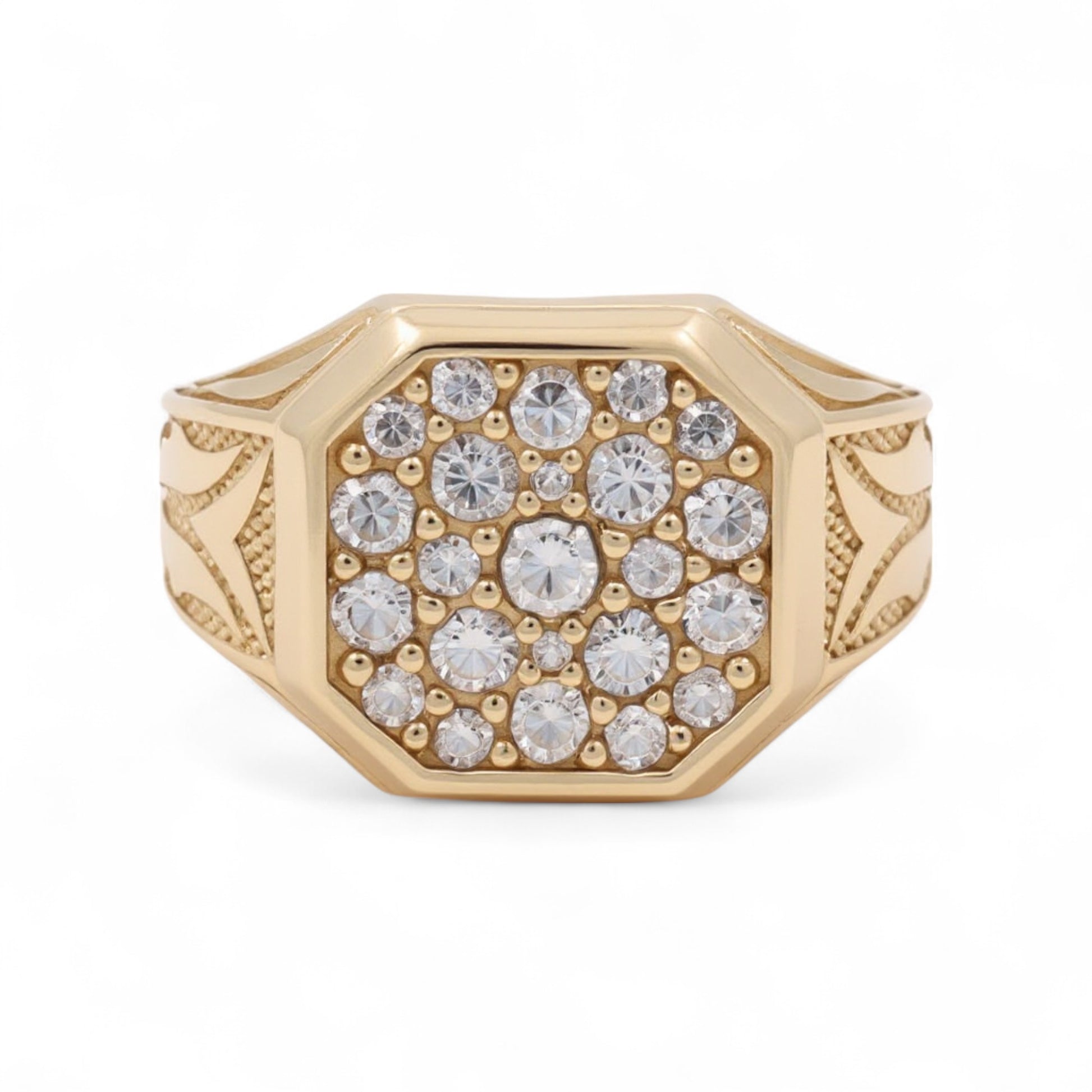This square-cut fashion ring for men is crafted in 14K yellow gold and adorned with radiant white cubic zirconia. With a substantial weight of 8.4 grams, it balances refined design with a bold structure—ideal for those who appreciate classic style with a contemporary edge.