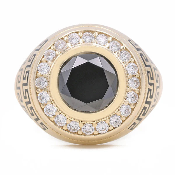 Make a strong statement with this commanding 14K yellow gold men’s ring, featuring a bold round face, intricate black enamel Greek key pattern, and a striking red cubic zirconia centerpiece. The Greek motif symbolizes eternity, strength, and unity, while the fiery red CZ adds intensity and distinction.