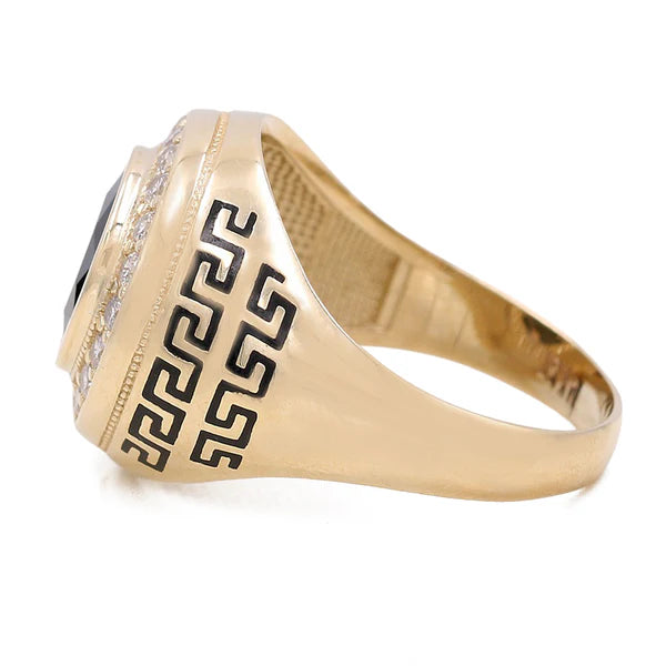 14k Round Men's Ring with Black Enamel Greek and Red Cz / Size 11 / Weight 9.5 GR / BOMR4FS-7