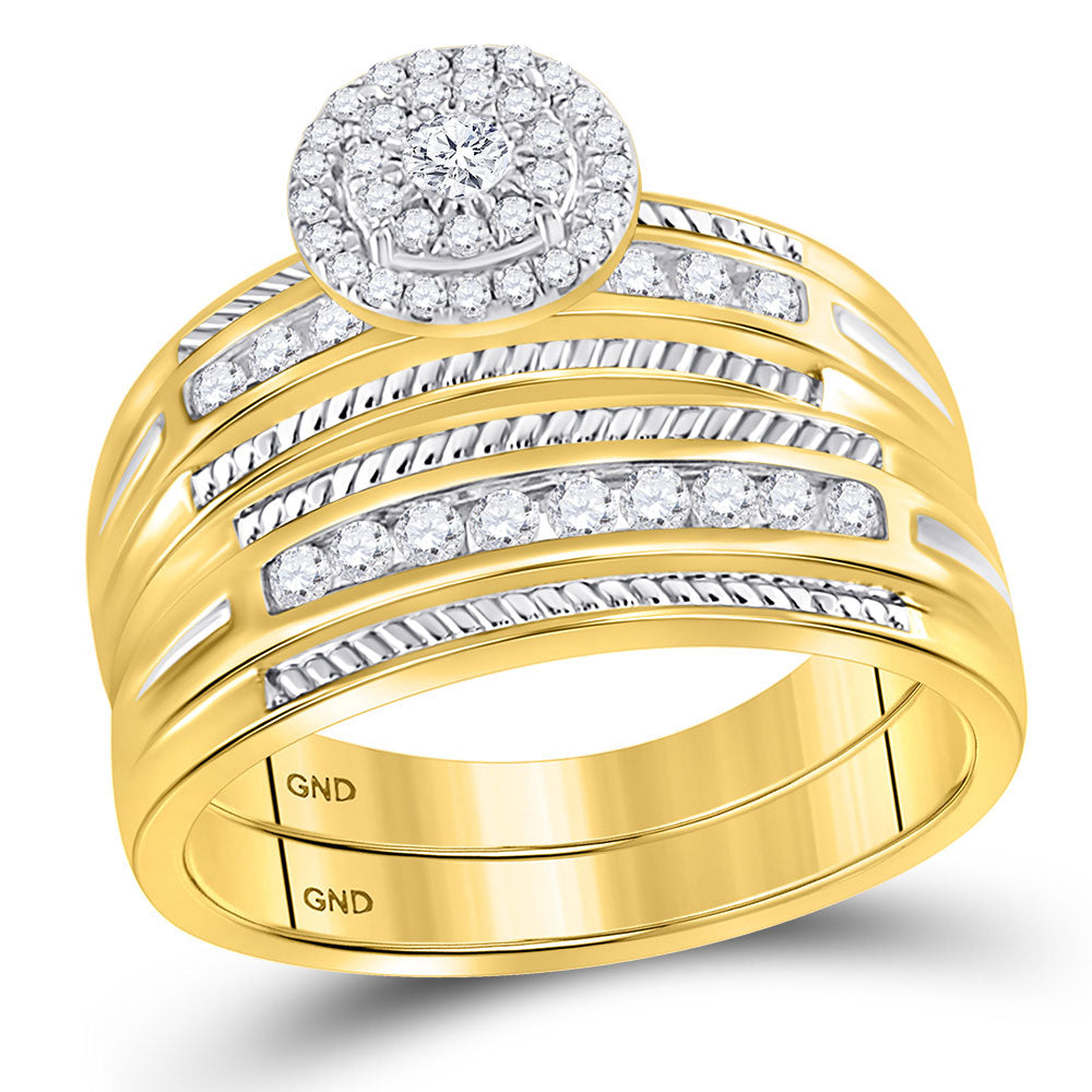 Celebrate your union with this perfectly matched 10K Yellow Gold Trio Set. This comprehensive three-piece collection includes a beautiful engagement ring, a coordinating ladies' wedding band, and a matching men's wedding band. Adorned with 5/8 carats total weight of genuine diamonds, this set offers a cohesive and elegant look for the bride and groom at an exceptional value.