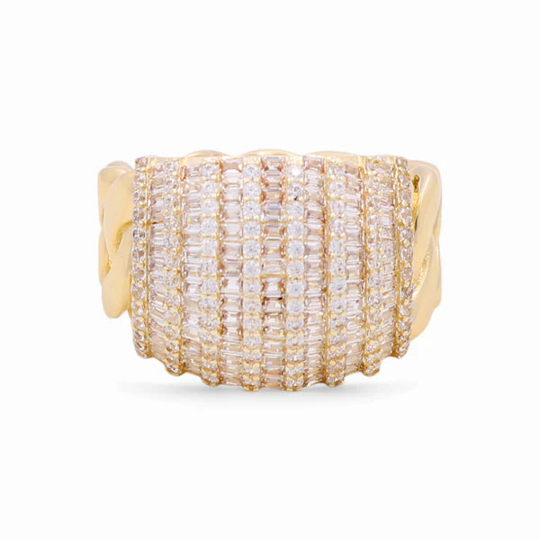 This 10K yellow gold ring features a stunning baguette-cut design set with radiant white stones, offering a modern take on timeless glamour. Sized at 7 and weighing 6.5 grams, it’s a bold yet elegant piece—perfect for making a statement with refined sparkle.