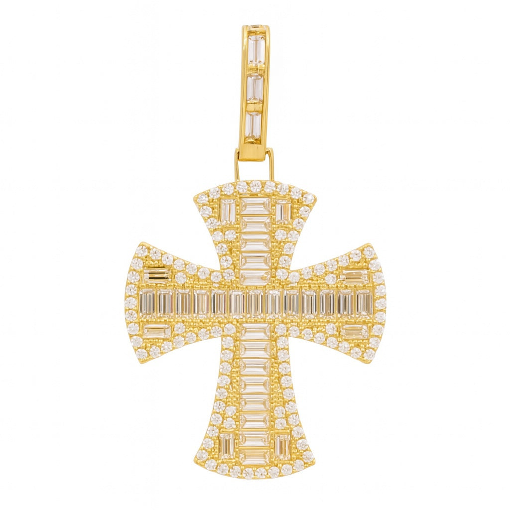 This 10K yellow gold fashion cross pendant blends timeless symbolism with a bold, contemporary twist. Its clean baguette-cut white stones add a radiant, geometric shine, offering both depth and elegance.
