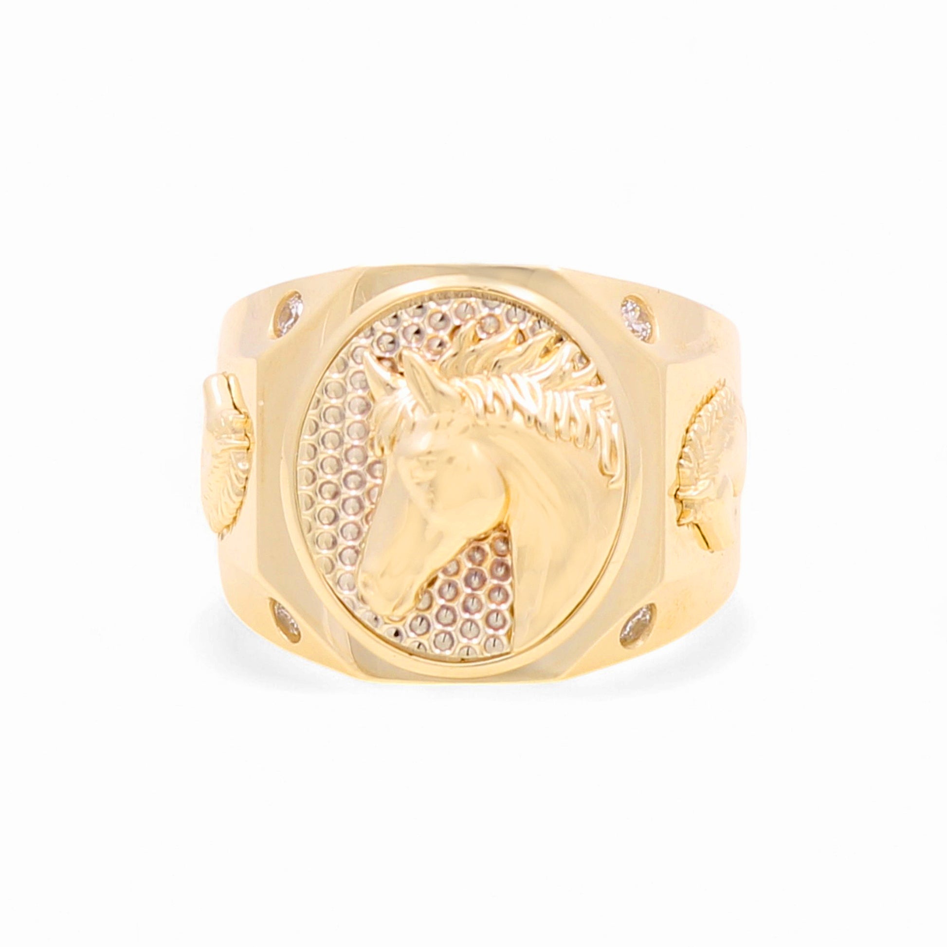 This bold 10K yellow gold men’s ring showcases a finely detailed horse design, accented with a brilliant cubic zirconia for added shine. A symbol of freedom and strength, it’s made for the man who leads with confidence and purpose.