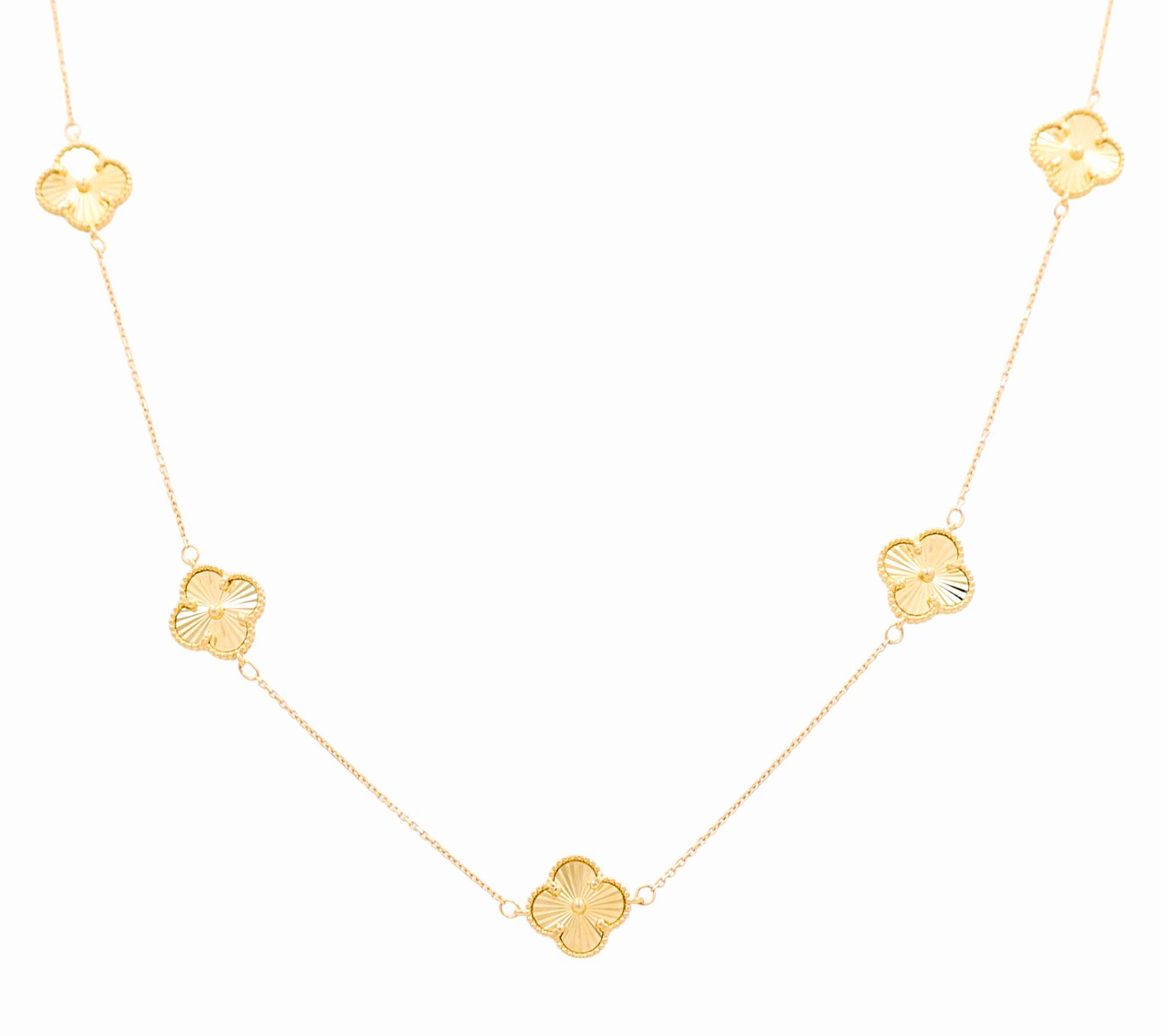 This 10K yellow gold necklace features five delicately crafted clover charms—symbols of luck, positivity, and timeless beauty. Measuring 18 inches and weighing 6.4 grams, it offers a graceful, lightweight design perfect for layering or wearing solo.