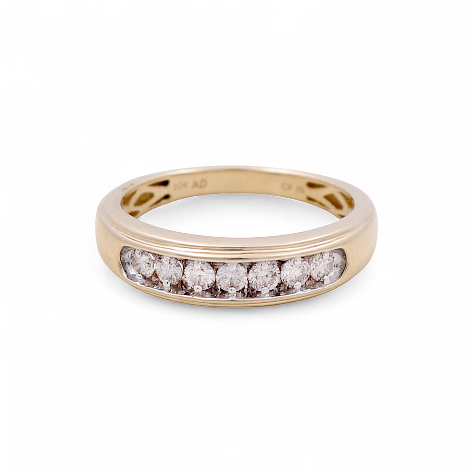 This 10K yellow gold men’s wedding band features 0.50 carat of radiant diamonds, symbolizing enduring love and unshakable promise. With its polished golden finish and bold design, it blends timeless elegance with masculine sophistication.