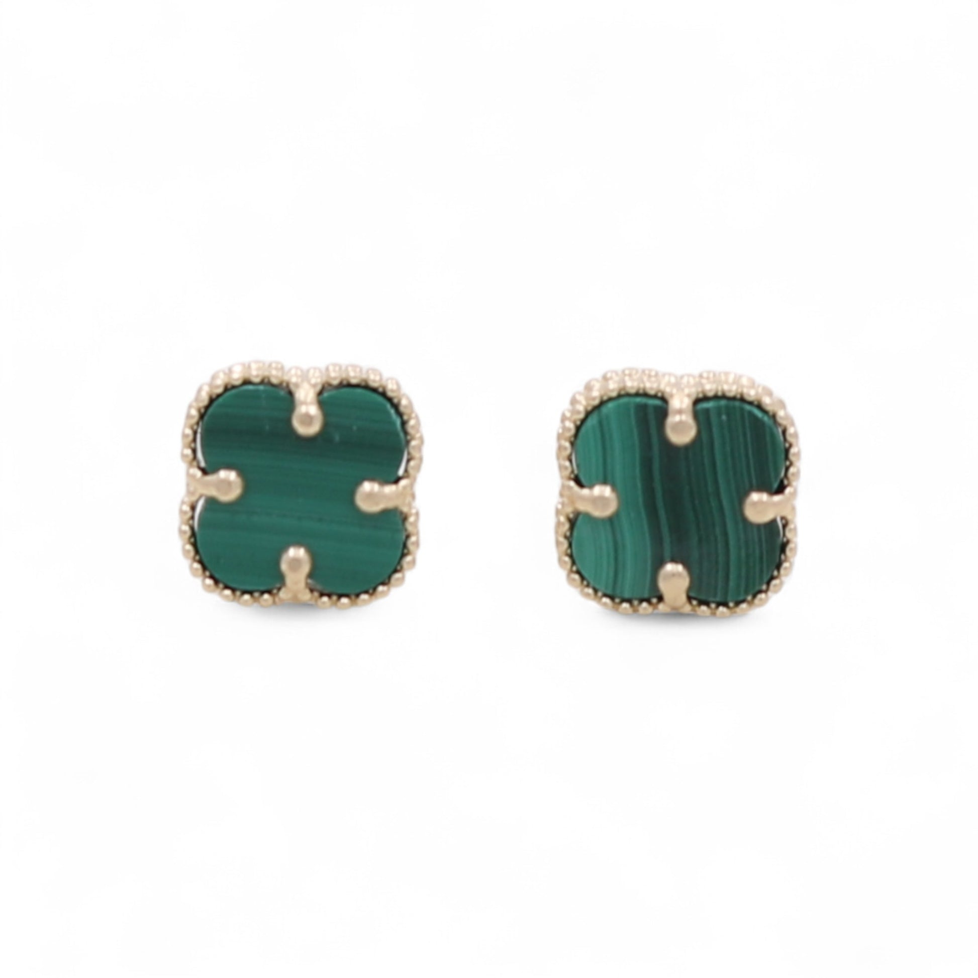 These 10K yellow gold stud earrings feature a delicate green clover design, symbolizing good fortune and timeless beauty. Their polished finish and vibrant color make them a playful yet elegant accessory for everyday wear.