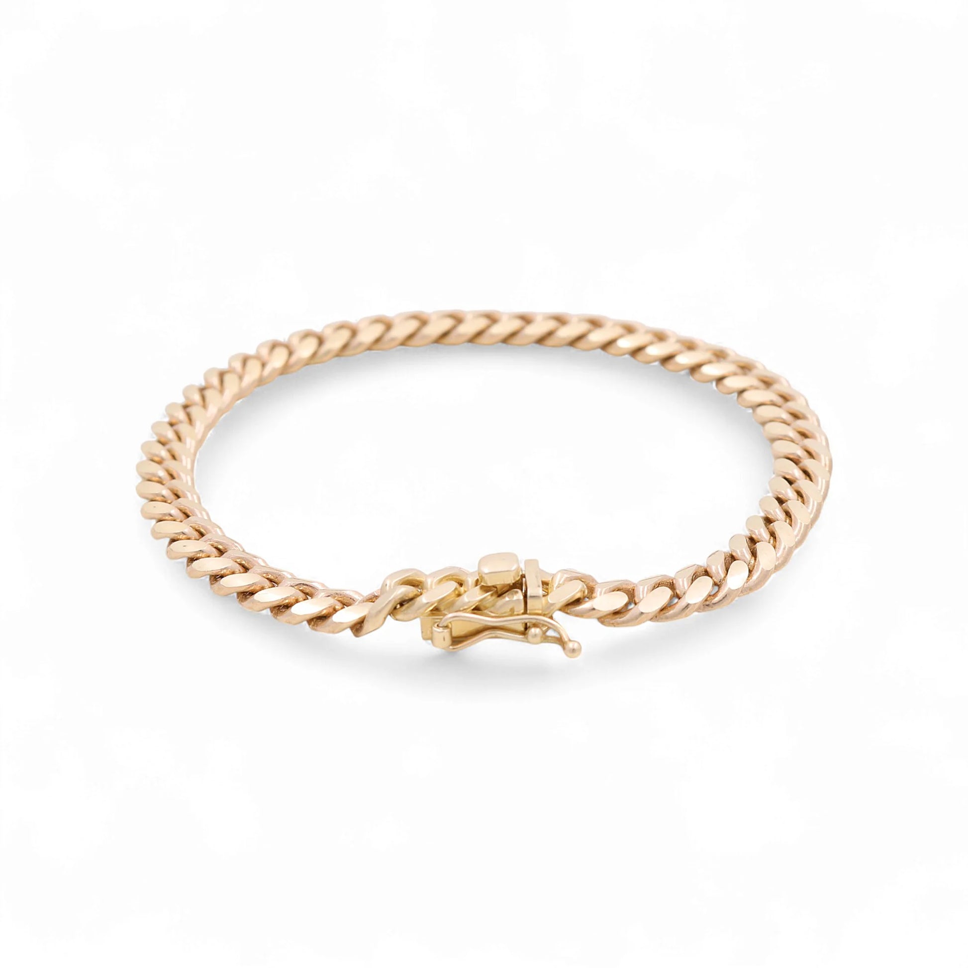This 10K yellow gold solid Cuban link bracelet features a 5mm width, offering a sleek and versatile design that balances elegance with everyday strength. Each tightly woven link is expertly polished, reflecting light with unmistakable brilliance and timeless appeal.