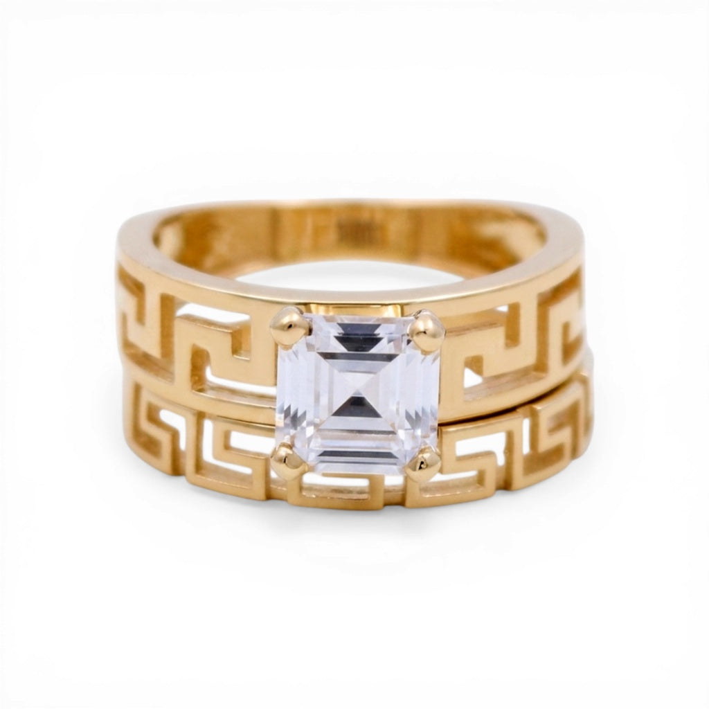 This 10K Yellow Gold Women’s Greek Bridal Set is a classic and meaningful choice, blending timeless symbolism with modern craftsmanship. Available in Size 8, this coordinated two-piece ensemble features the iconic Greek Key motif—a design representing the infinite and the eternal—making it a poetic and stylish selection for a wedding set. The set is skillfully crafted in 10K yellow gold, ensuring excellent durability for everyday wear while providing a rich, warm glow. The engagement ring serves as the focal point, featuring a radiant White Cubic Zirconia (CZ) that offers brilliant clarity and sparkle. The architectural Greek patterns along the bands add a touch of historical elegance and structural beauty, creating a sophisticated and cohesive look on the hand.