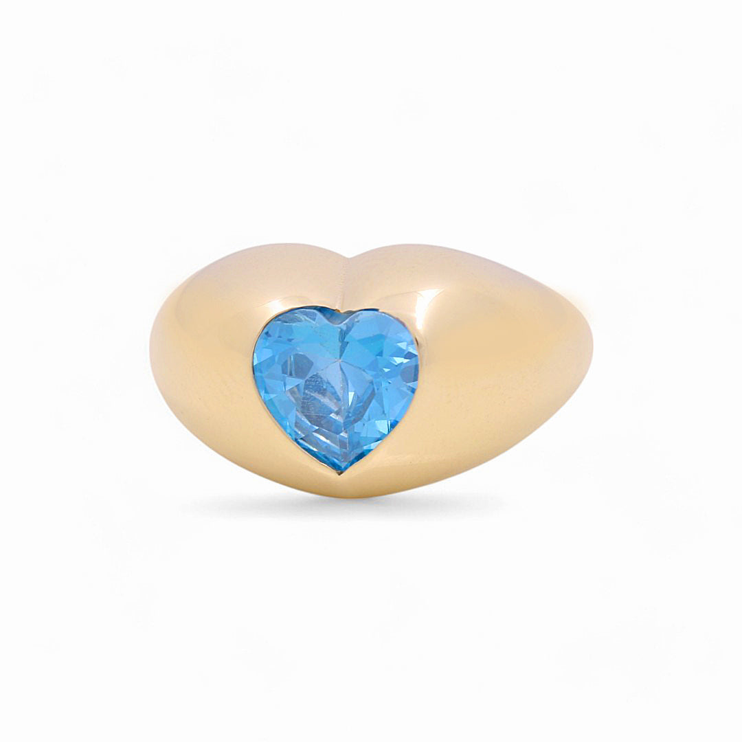 Dreamy and delicate, this 10K yellow gold heart ring showcases a luminous light blue cubic zirconia that evokes feelings of tranquility and peace. The heart-shaped design adds a romantic touch, while the polished gold band complements the soft hue of the stone. At 3.3 grams, it offers a comfortable fit and lasting beauty. Whether worn as a statement piece or paired with other rings, it’s an exquisite choice for any occasion.