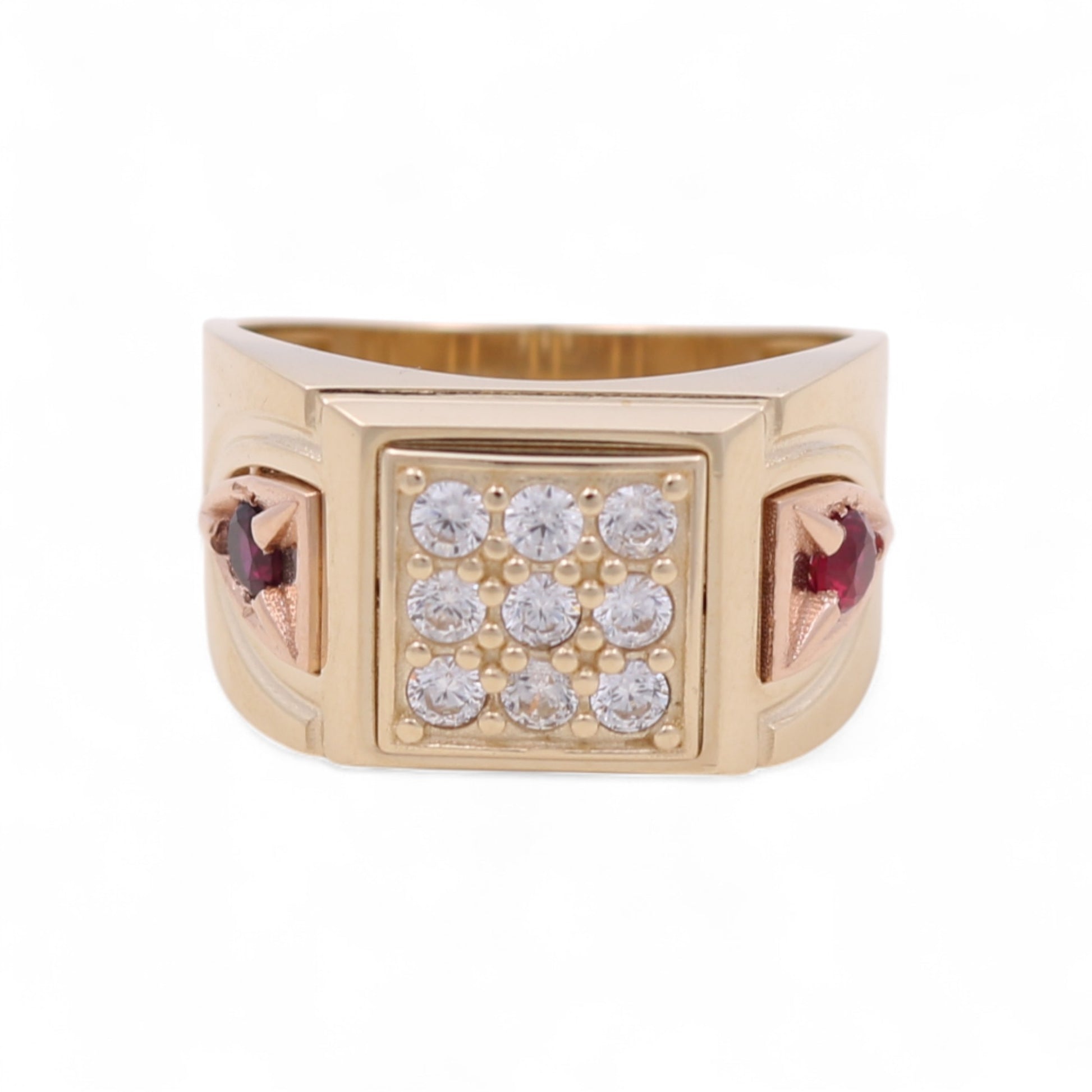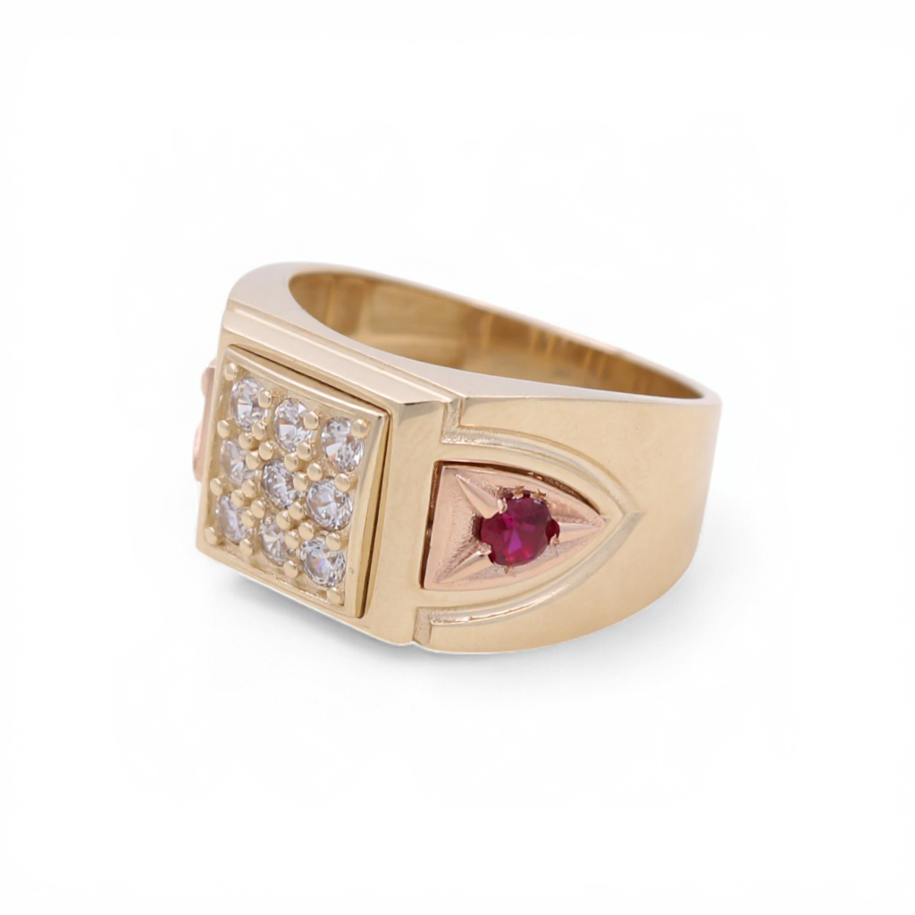 This 14K yellow and rose gold men’s ring features a striking design accented with red and white cubic zirconia. The rich two-tone gold and vibrant stones create a powerful combination of style and individuality.