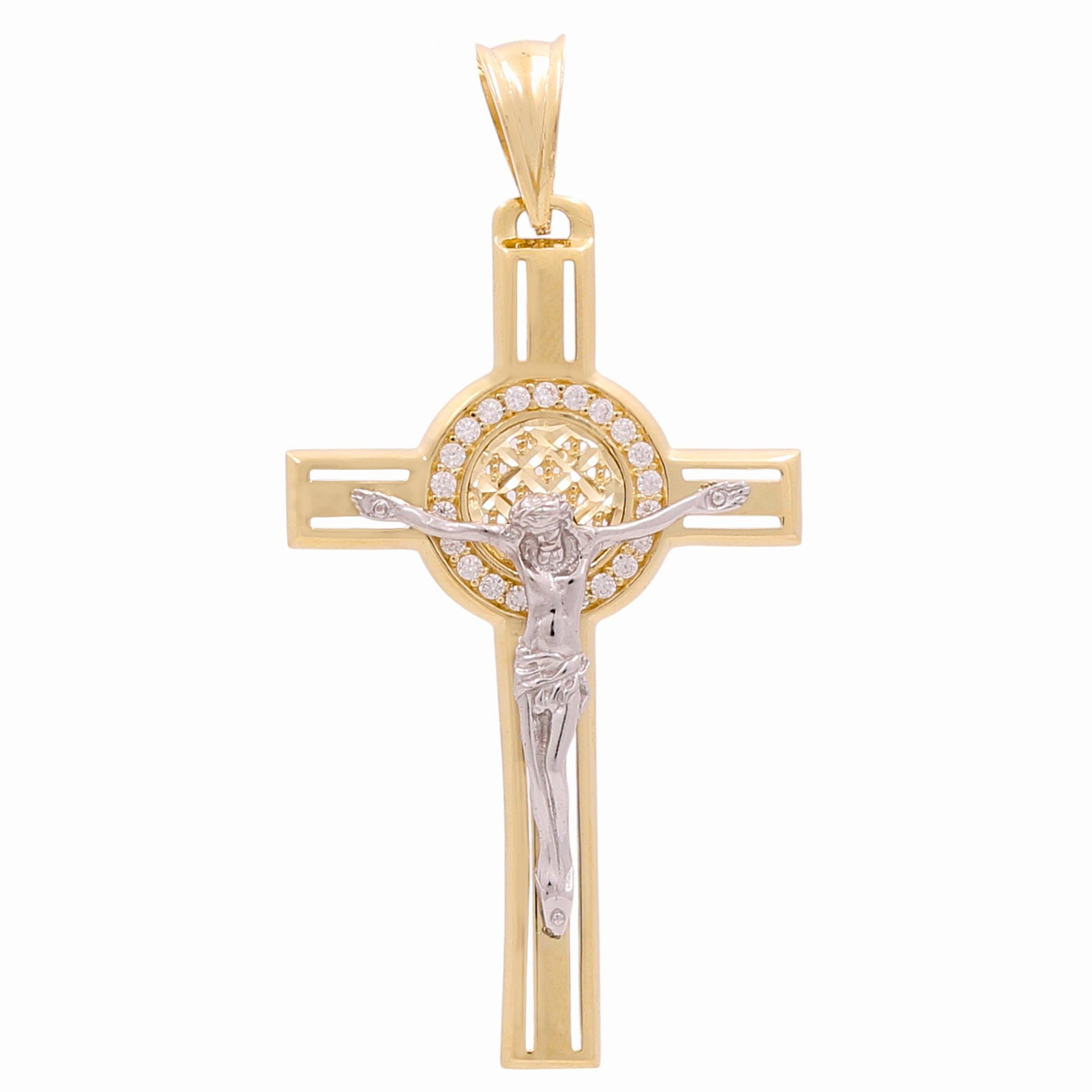 This 14K yellow and white gold cross pendant features a finely crafted image of Christ and is accented with cubic zirconia for added shine. Weighing 7 grams, it offers a bold, meaningful presence — combining faith, craftsmanship, and radiant beauty in one powerful piece.