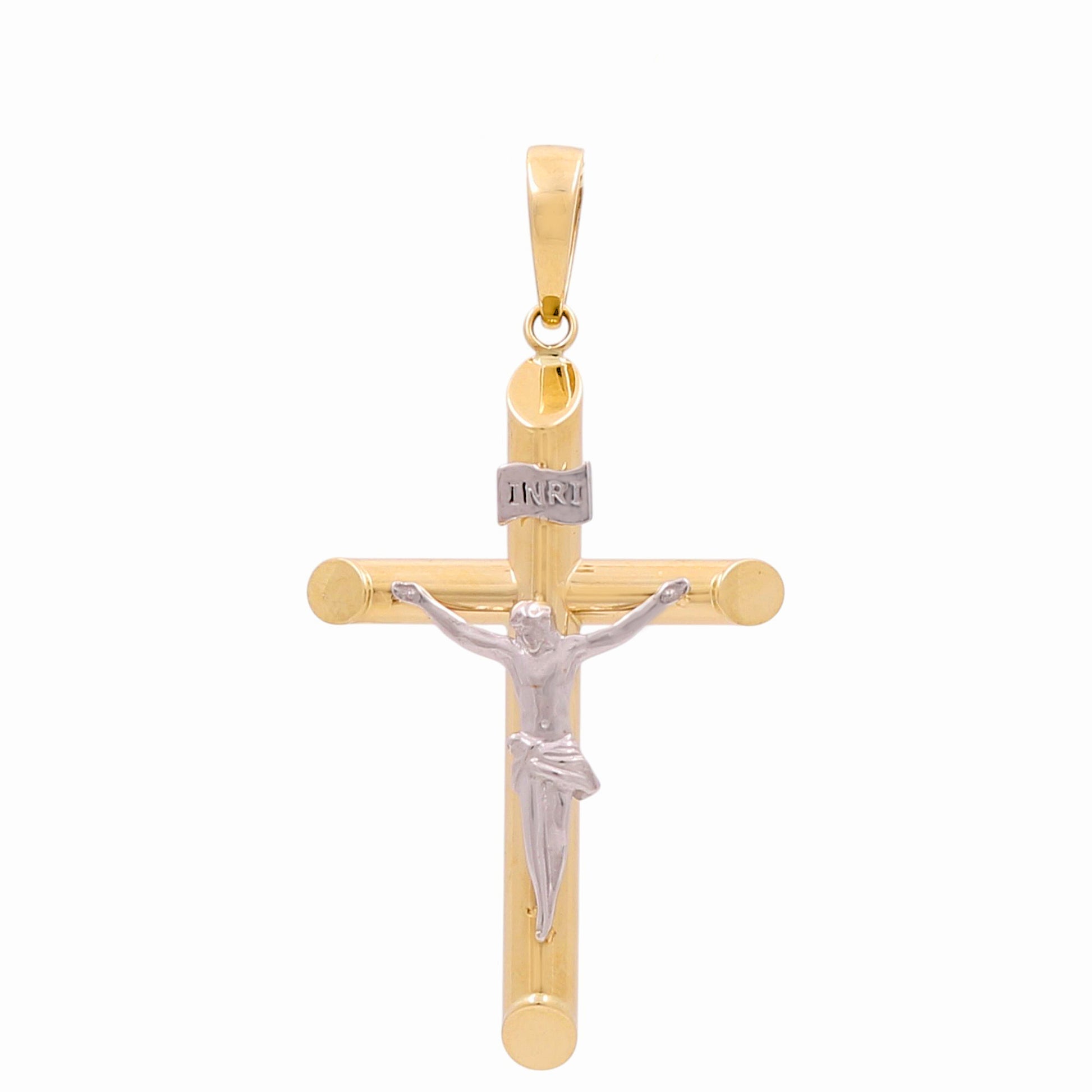 This 14K yellow and white gold cross pendant features a detailed image of Christ, blending two tones of gold for a striking, meaningful design. Sized big and weighing 2.2 grams, it’s a powerful yet lightweight symbol of devotion.