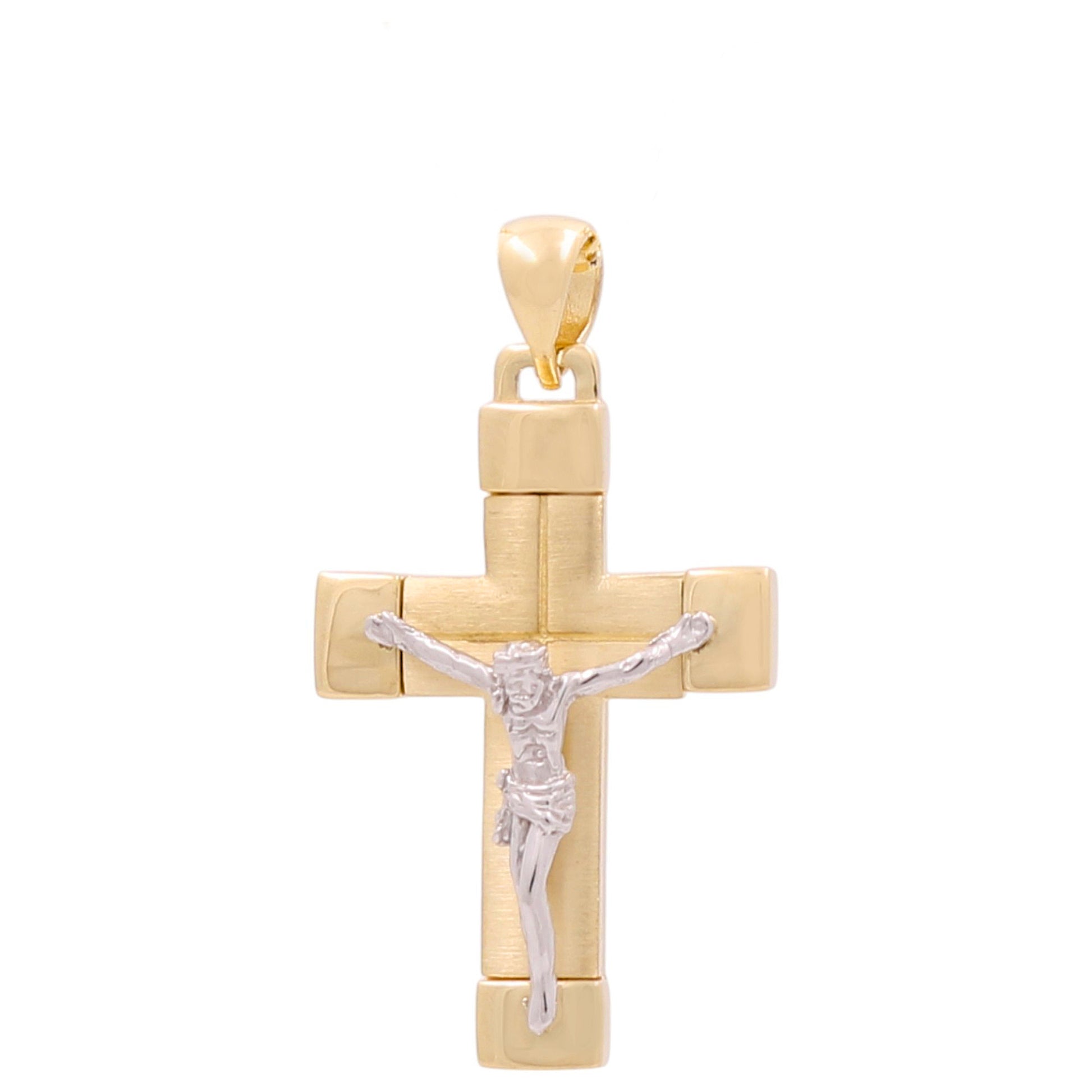This 14K yellow and white gold cross pendant features a detailed image of Christ, blending spiritual meaning with timeless craftsmanship. Weighing 4.1 grams, it’s a powerful expression of devotion, made to be worn close and treasured always.