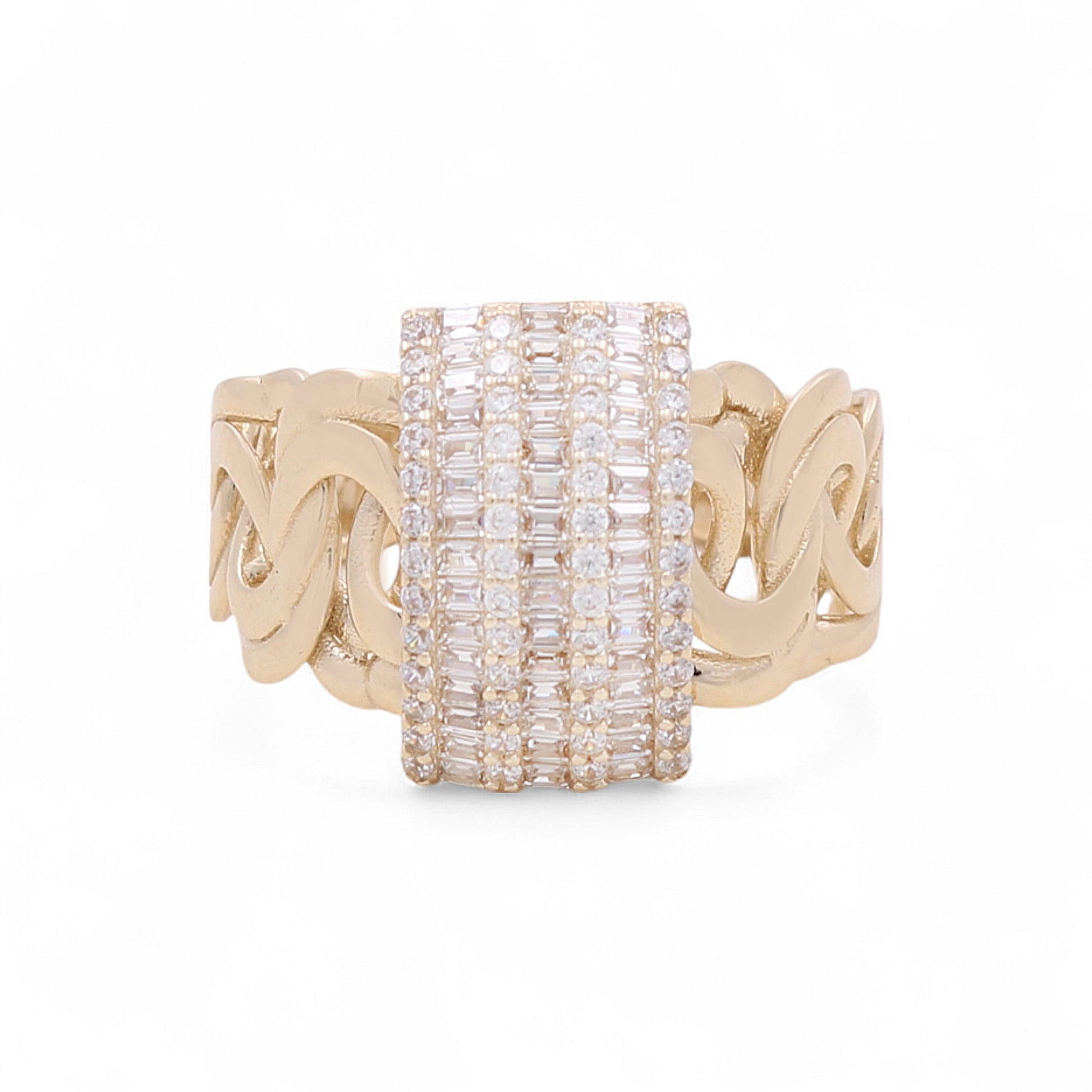 Crafted in 14K yellow gold, this stunning ring features baguette-cut cubic zirconia in a bold, structured design—offering a perfect blend of modern edge and timeless elegance. Sized at 7.5 and weighing 5.6 grams, it’s a radiant statement piece for those who love to shine with style.