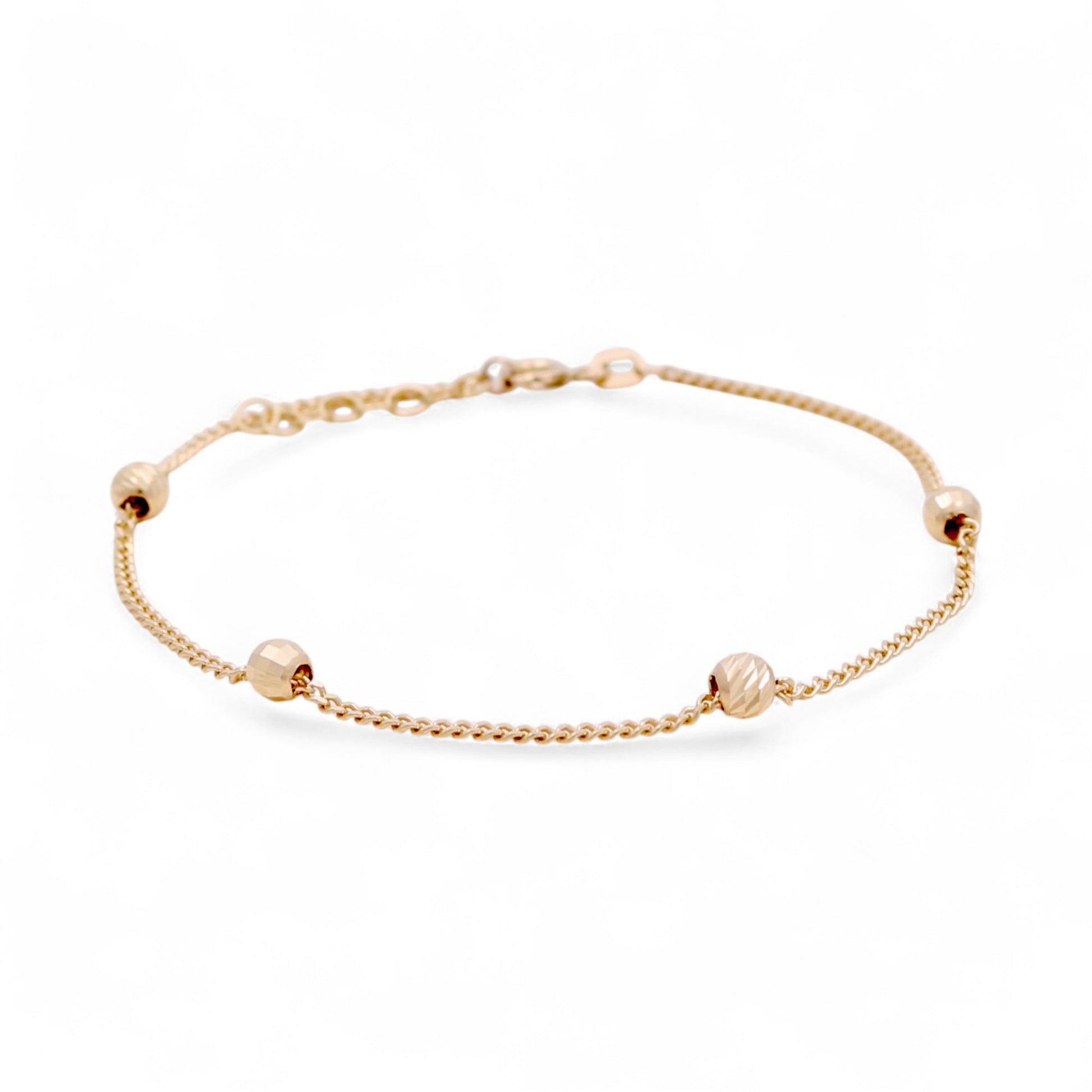 This 14K yellow gold bracelet features polished diamond-cut balls that shimmer with every movement, adding elegance and subtle brilliance. Its refined design makes it a versatile accessory, perfect for layering or wearing on its own.