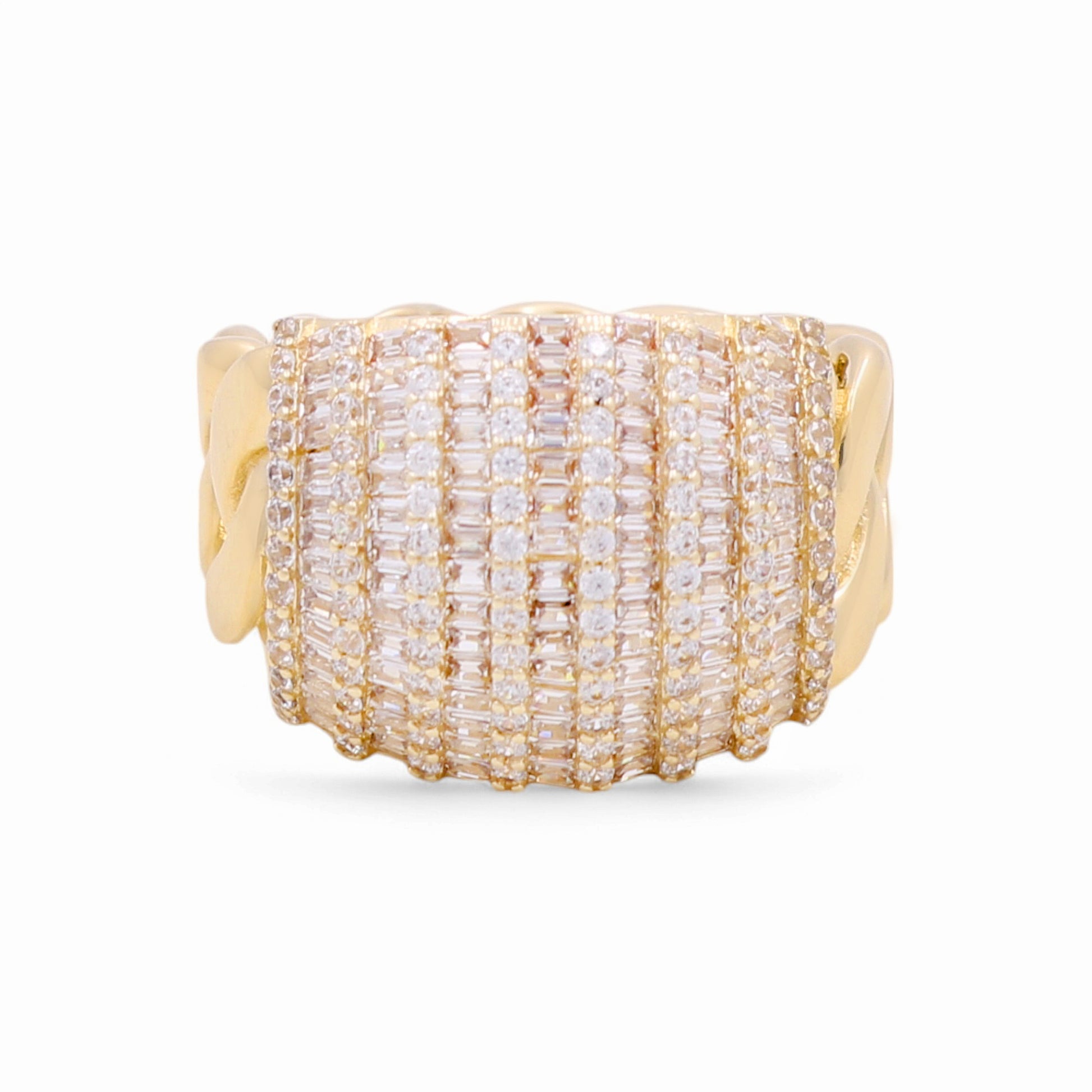 This bold 14K yellow gold women’s ring features a unique chain-inspired design accented with sparkling cubic zirconia, blending modern edge with refined glamour. Its striking look makes it a powerful statement piece for any jewelry collection.