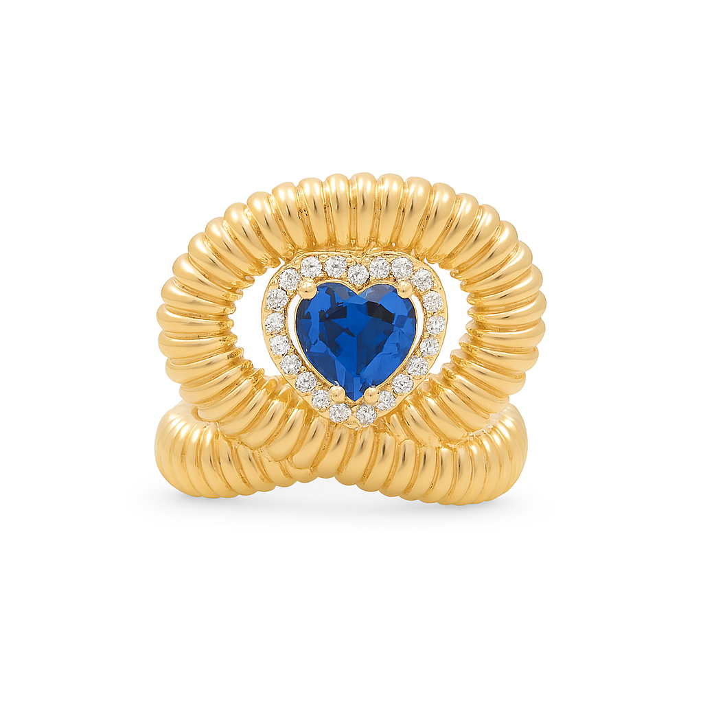 Crafted in radiant 14K yellow gold, this heart-shaped women’s ring features a captivating mix of blue and white cubic zirconia, creating a striking contrast of color and sparkle. Weighing 6 grams, it’s a bold yet elegant piece—perfect for making a romantic and stylish statement.