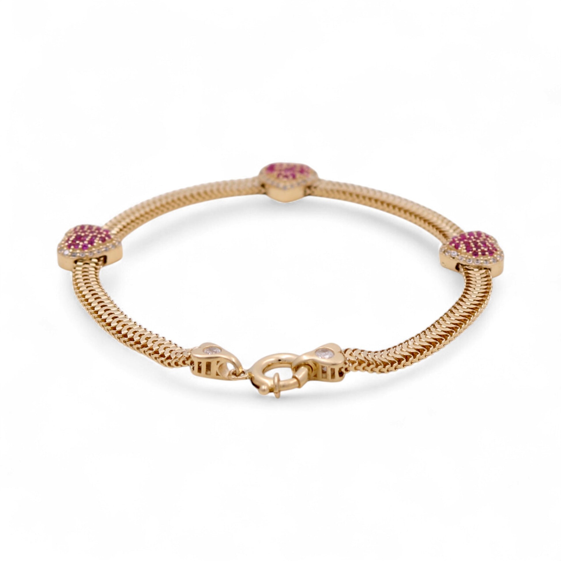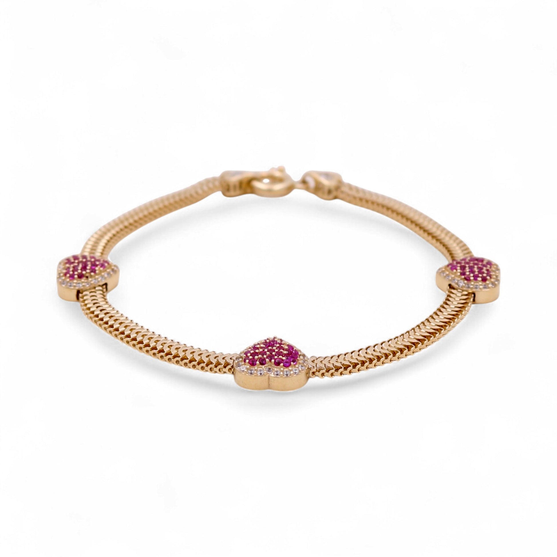 This 14K yellow gold bracelet features interlocking heart links, beautifully accented with sparkling pink cubic zirconia for a feminine and radiant finish. Its polished design combines charm and sophistication, making it perfect for both everyday wear and special occasions.