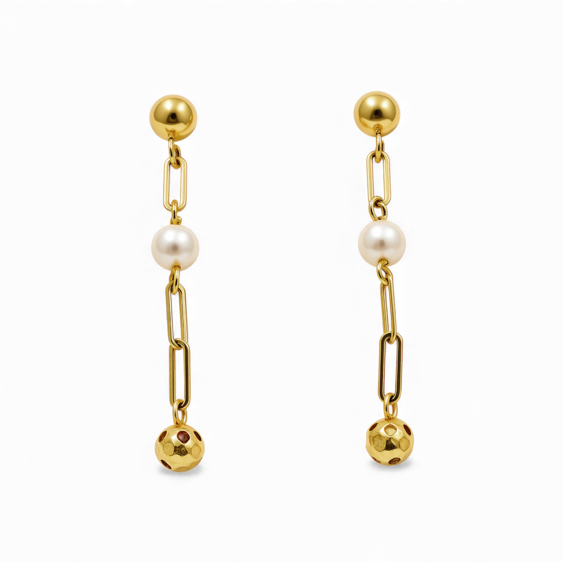 14K Yellow Gold Fashion Paper Clip Stud Earrings with Balls and Pearl