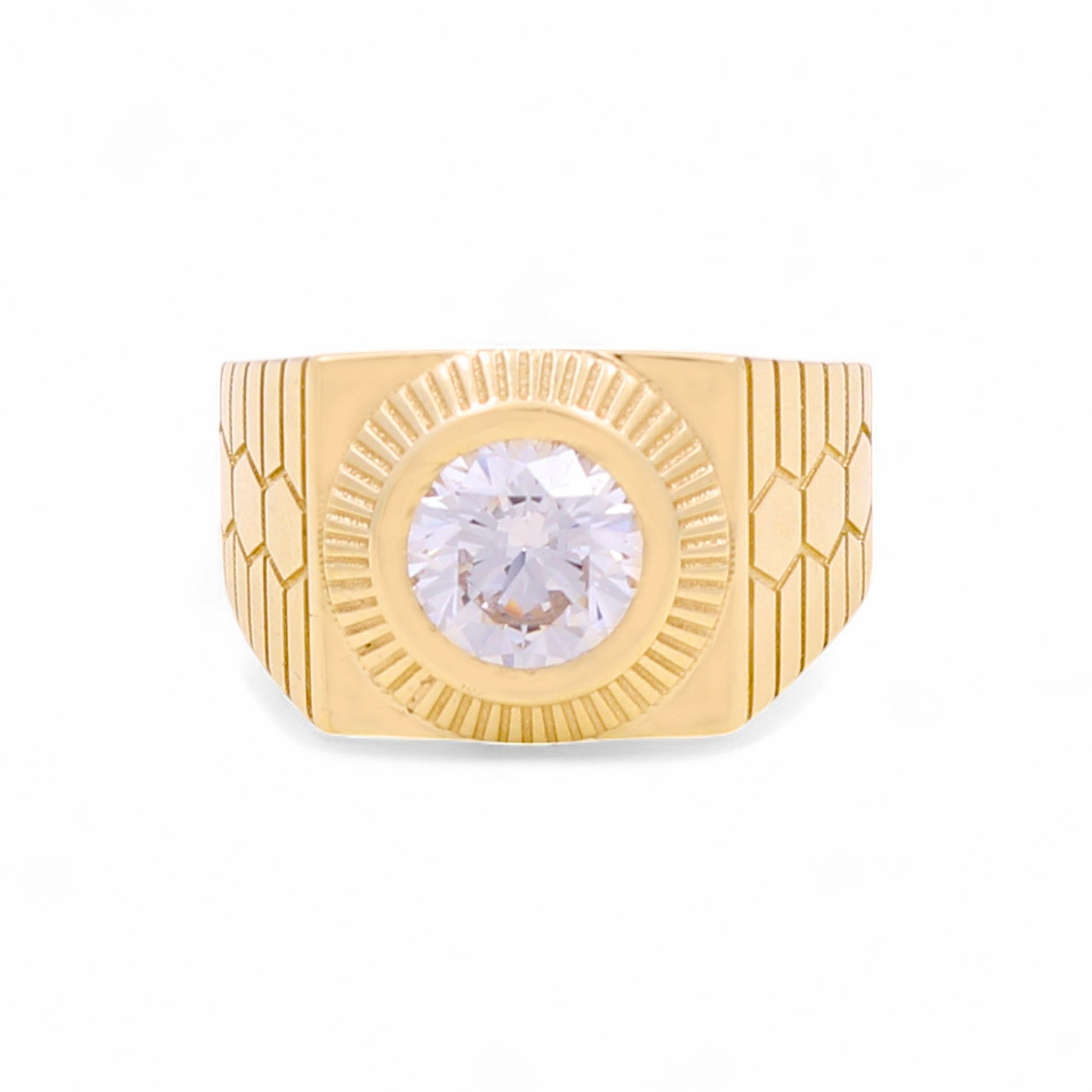 This 14K yellow gold men’s round ring features a sleek, timeless design set with a brilliant white cubic zirconia, offering understated elegance with a confident edge. Crafted in size 10 and weighing 6.7 grams, it’s perfect for everyday wear or standout moments.