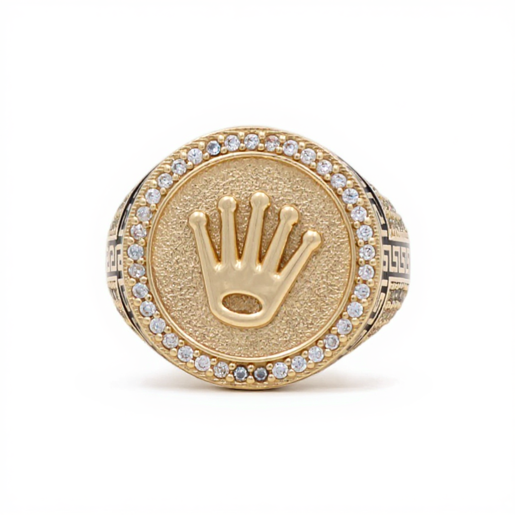 This 14K yellow gold men’s RX-style ring features a polished, architectural design accented with brilliant white stones—combining strength, sophistication, and timeless elegance. The clean lines and subtle sparkle make it a standout piece for any occasion.