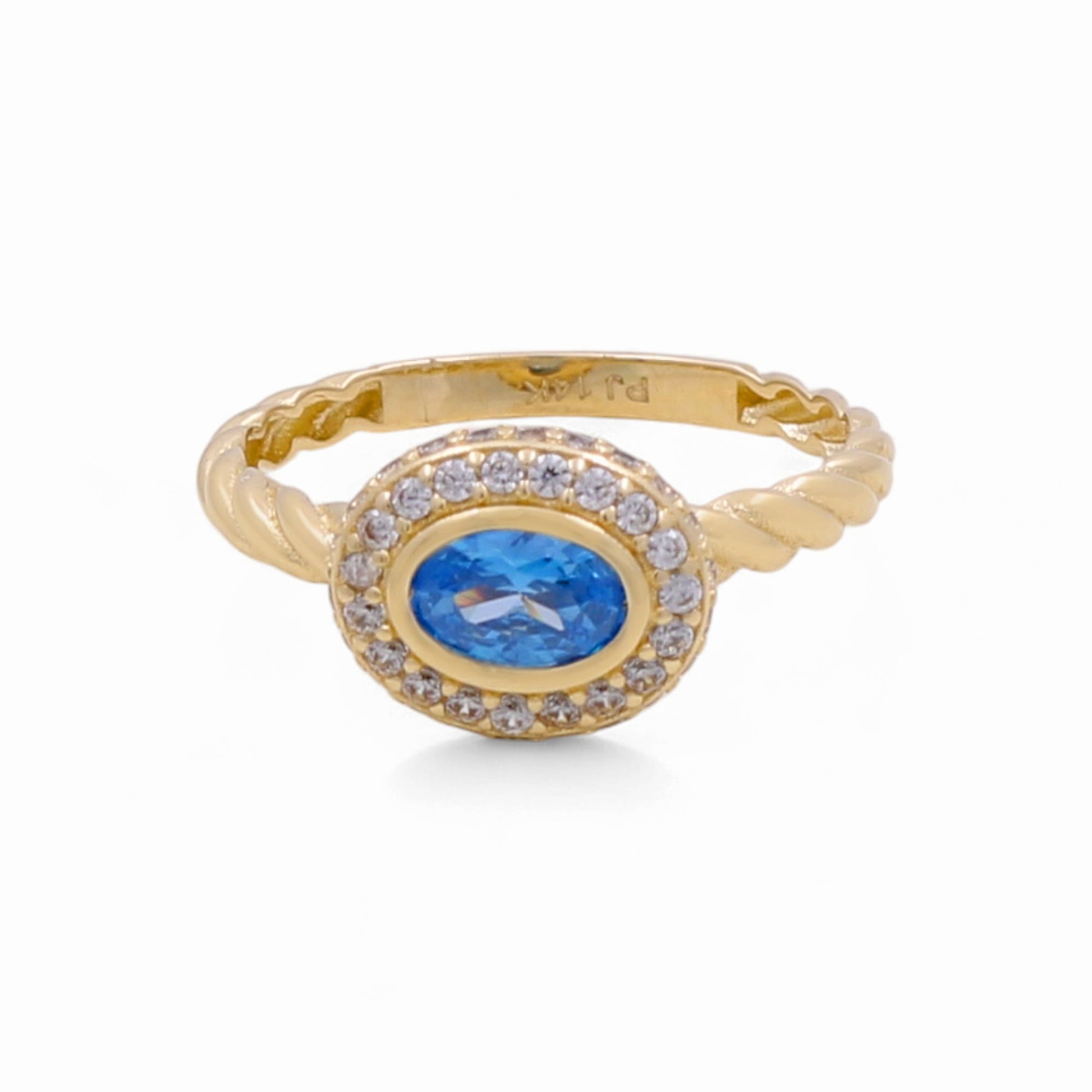 This eye-catching 14K yellow gold women’s ring features a brilliant blue cubic zirconia set in a sleek, polished design—blending timeless style with a fresh pop of color. Perfect for adding a touch of sophistication and personality to any outfit.