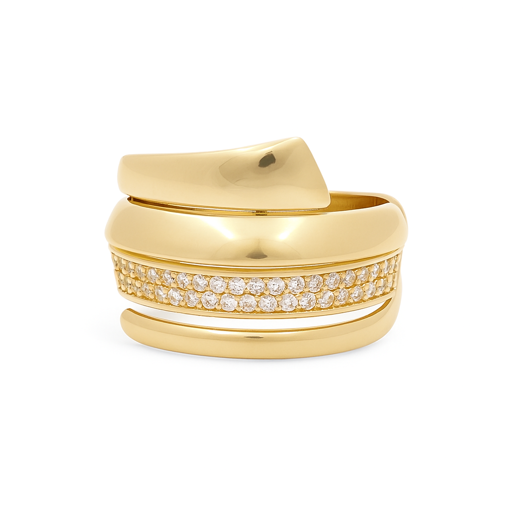 This 14K yellow gold women’s fashion ring features a polished band set with dazzling white cubic zirconia, combining classic elegance with a modern touch. Its wider design gives it a strong presence, perfect for those who love statement pieces with refined shine.