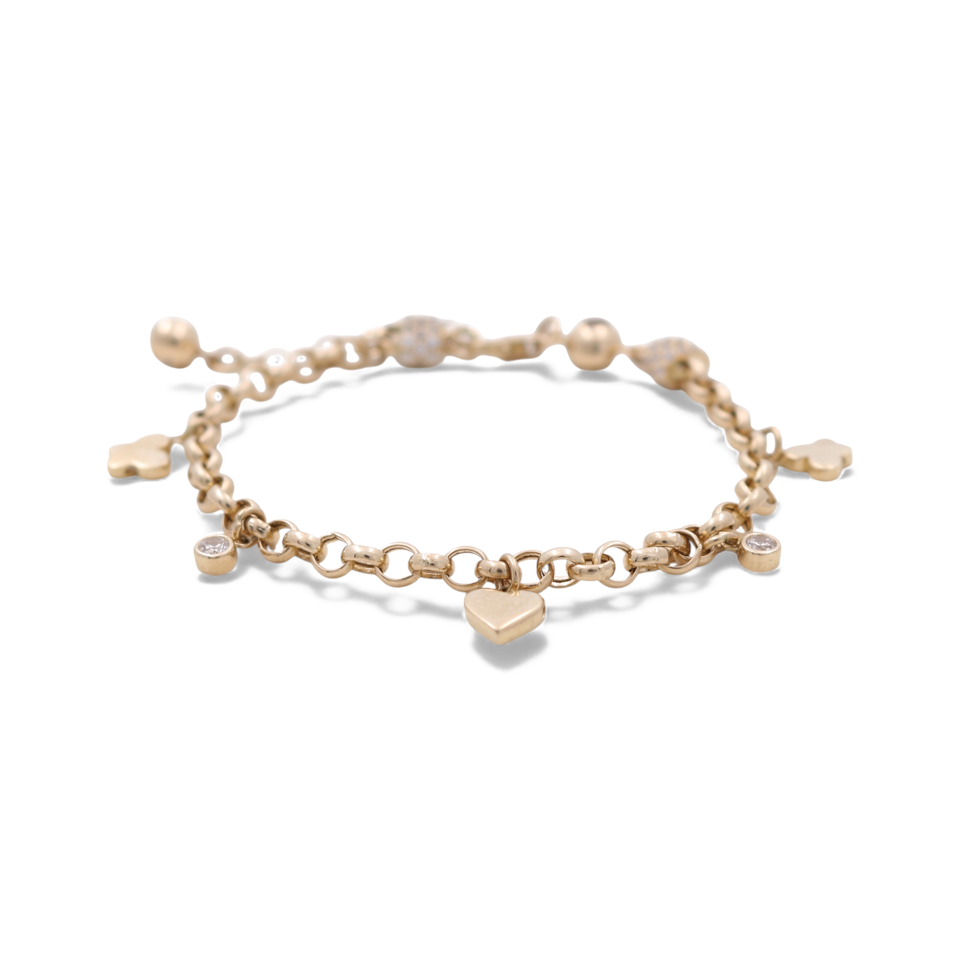 14K Yellow Gold Rolo Link Women’s Bracelet with Charms and CZ