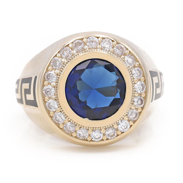 14K Yellow Gold Round Men's Ring with Black Enamel Greek and Blue Cz / Size: 10 / Weight: 9.2 GR / BOMR4FS-8