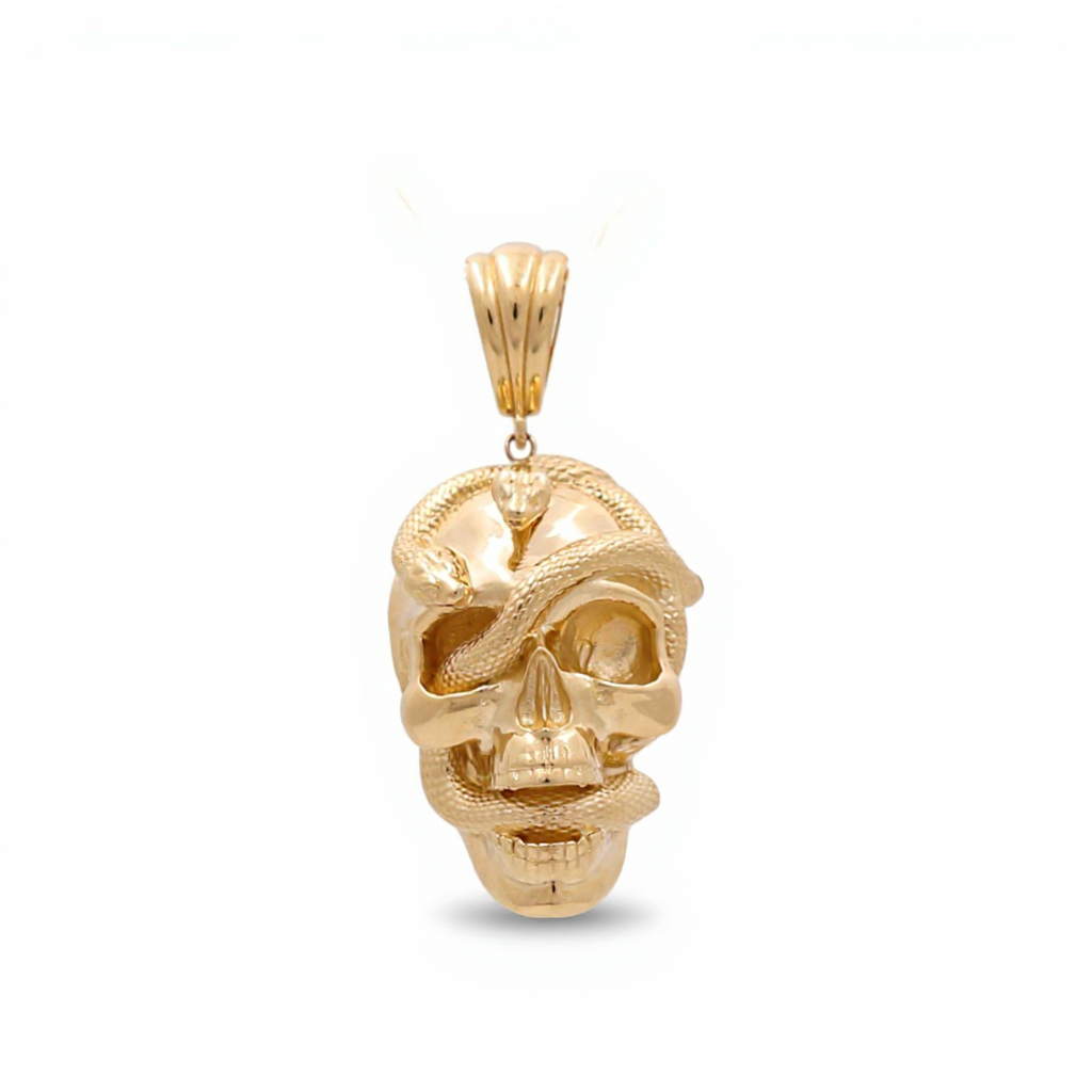 This 14K yellow gold pendant features a striking skull entwined with detailed snakes, representing power, transformation, and resilience. Its polished finish and intricate craftsmanship create a piece that is as daring as it is sophisticated.