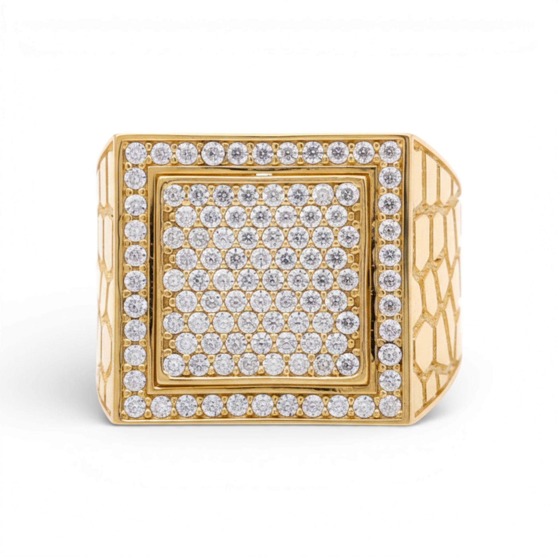 Make a bold statement with this classic 14K Yellow Gold Men's Nugget ring. Featuring a distinct square top profile, this ring showcases the traditional rugged "nugget" texture that has been a staple of men's jewelry for decades. The design is upgraded with dazzling white stones set into the face, adding a flash of brilliance to the raw gold texture. Weighing a substantial 7.6 grams, this ring feels heavy and solid on the hand, signifying true quality. The Size 10.5 fit is a comfortable standard size for most men.