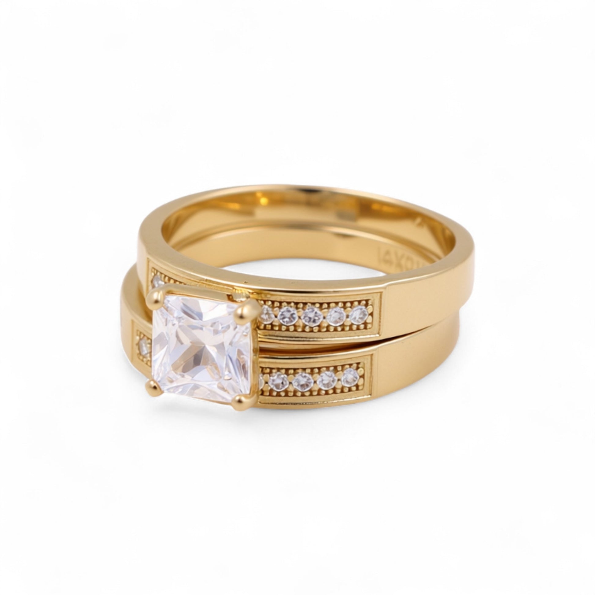 This 14K yellow gold bridal set features a captivating arrangement of sparkling cubic zirconia, designed to symbolize everlasting love and devotion. Elegant and timeless, it pairs classic craftsmanship with radiant golden warmth.
