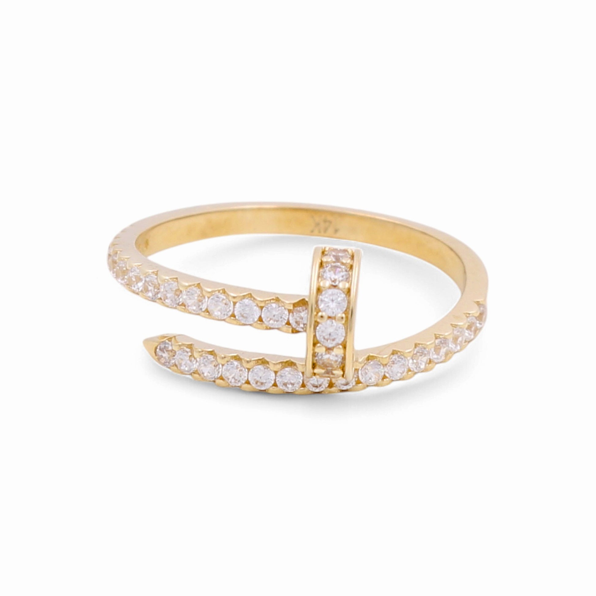 This bold 14K yellow gold women’s nail ring wraps around the finger in a sleek, contemporary design, accented with sparkling cubic zirconia for a touch of refined brilliance. Inspired by strength and style, it’s a statement piece with attitude and elegance.