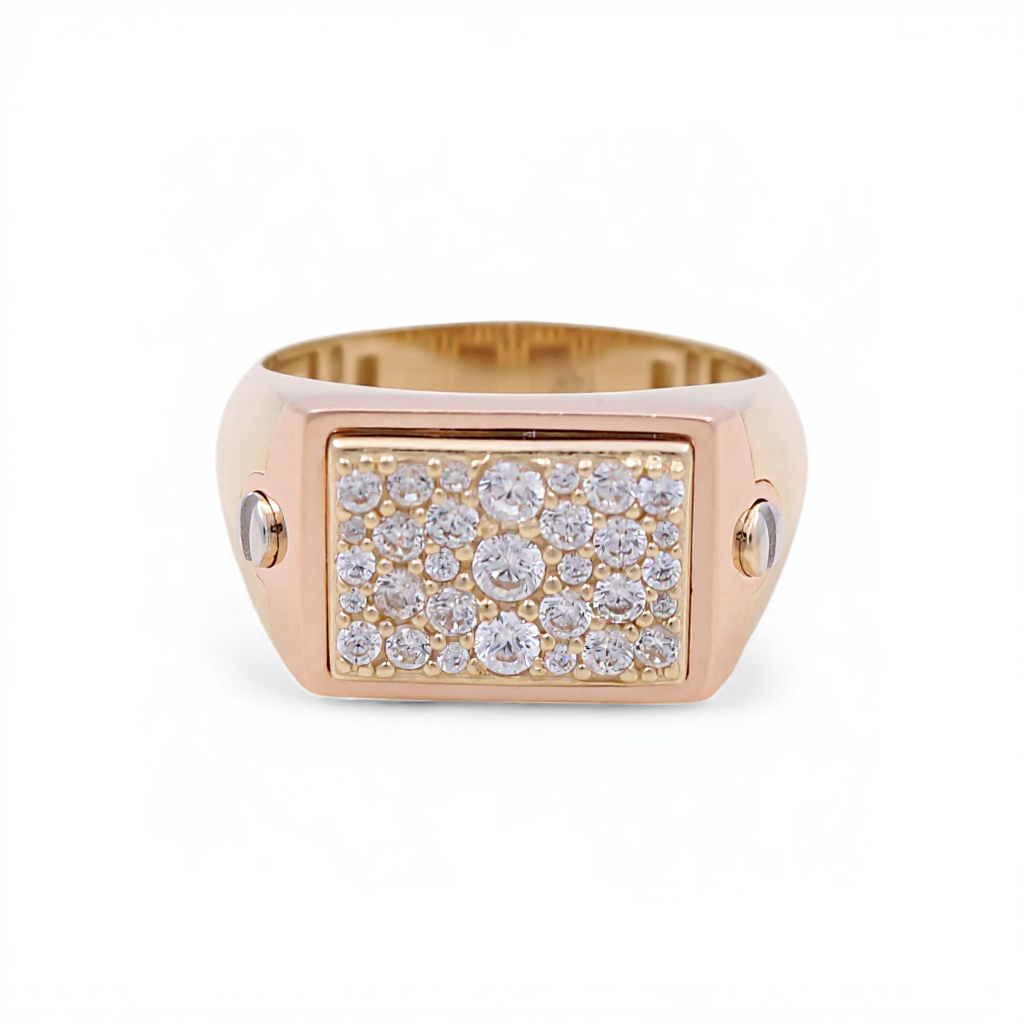 This 14K yellow, white, and rose gold men’s ring features a distinctive three-tone design that blends classic craftsmanship with modern appeal. Its polished finish and unique color contrast make it a versatile statement piece for any collection.